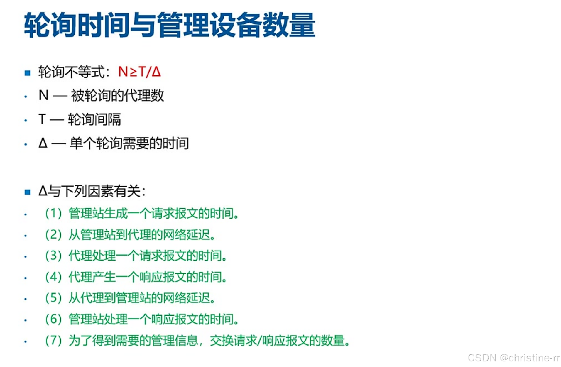 轮询时间与设备数量关系 | 公式:N ≤ T/Δ(N:设备数, T:轮询间隔, Δ:单次轮询耗时) | 计算题高频考点(Δ含7个时间因素,如报文处理、网络延迟等) | ⭐⭐⭐⭐ |