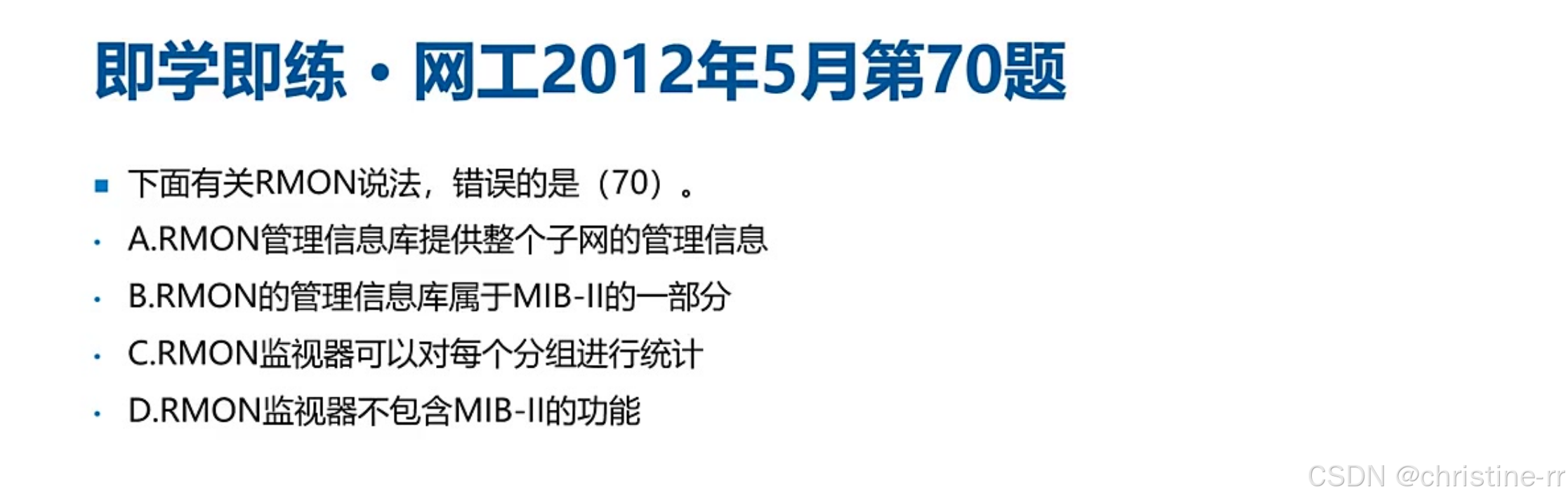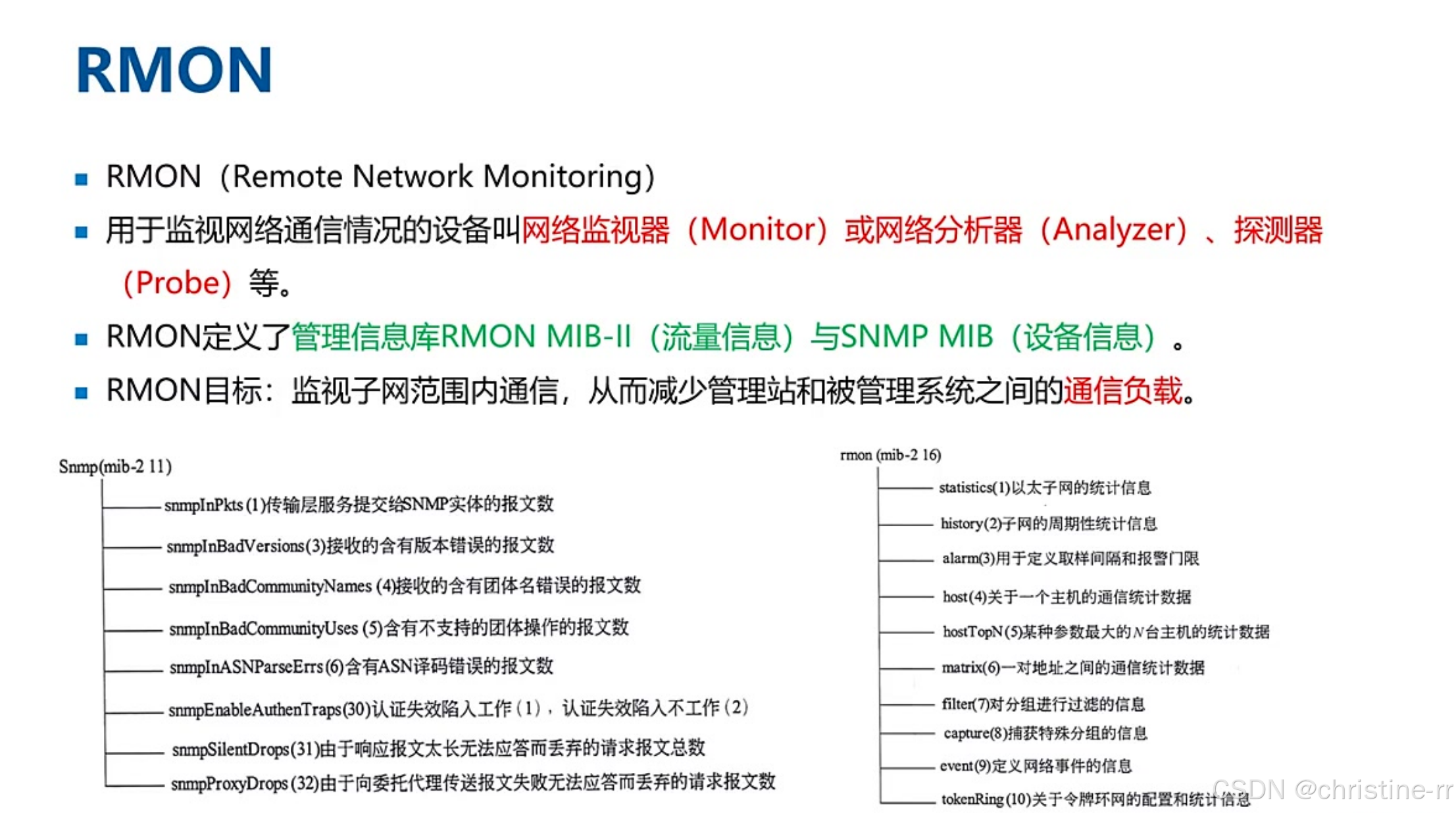RMON协议 | 含两个库:RMON MIB(流量) + SNMP MIB(设备) | 易错点:RMON监视器包含SNMP功能(错误选项常反向描述) | ⭐⭐⭐ |