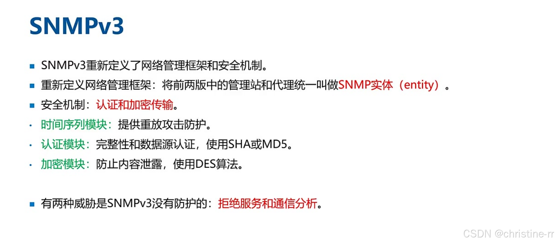 版本演进 | v1(团体名认证)、v2(新增GetBulk/Inform)、v3(认证加密+访问控制) | v3安全机制:SHA/MD5认证,DES加密,不防DoS/通信分析 | ★★★★☆ |