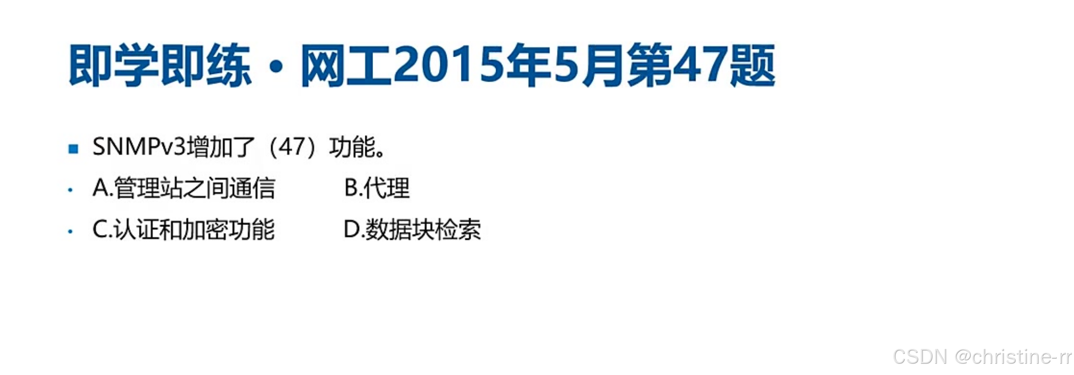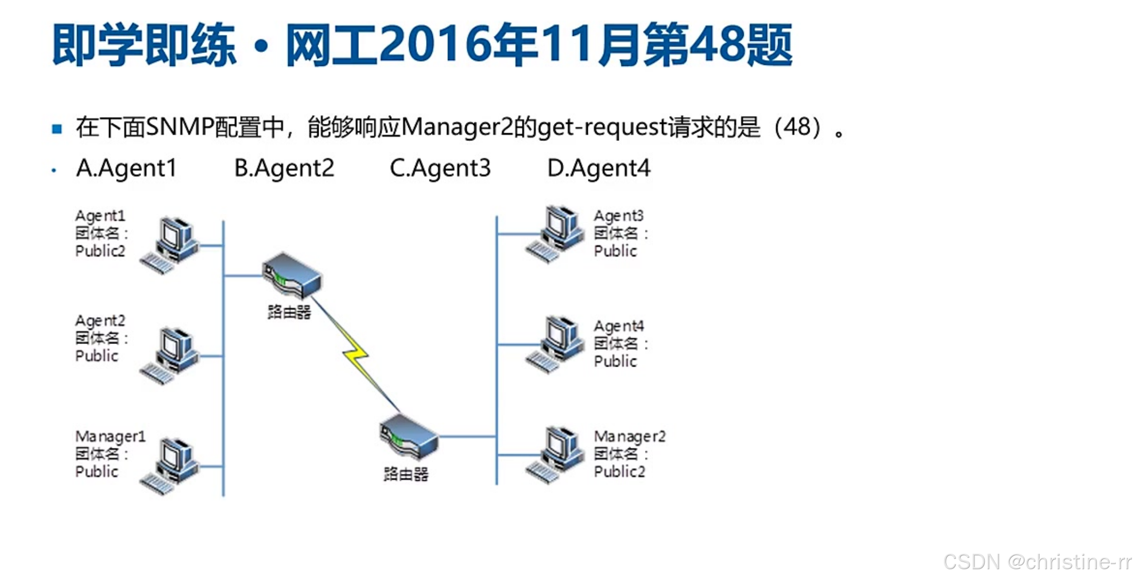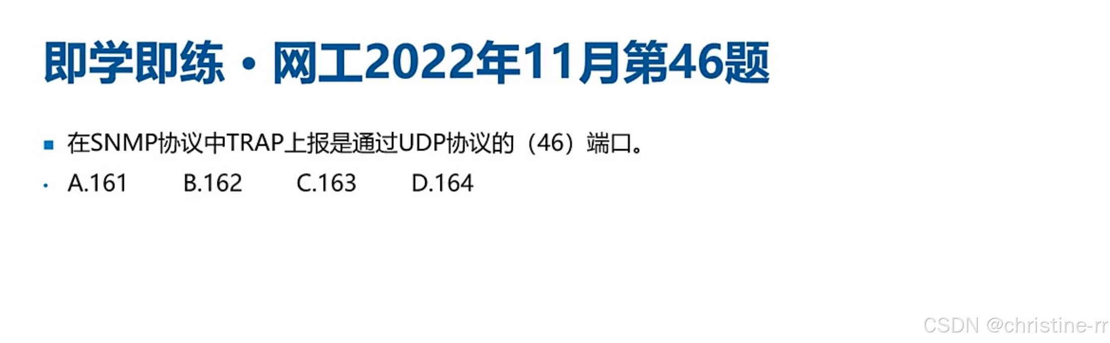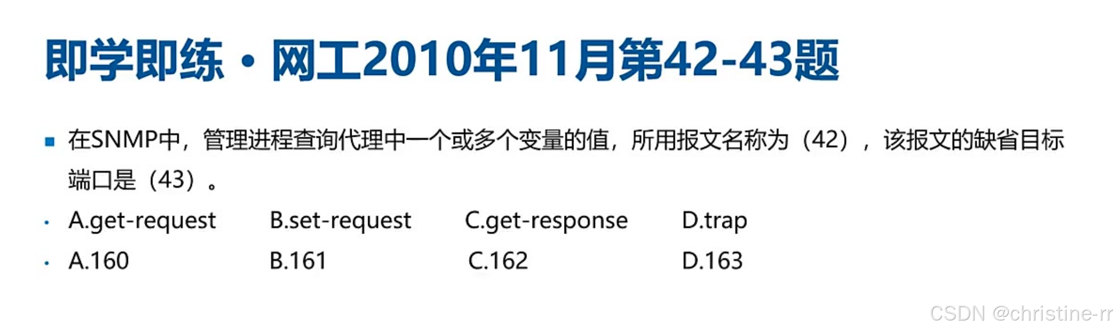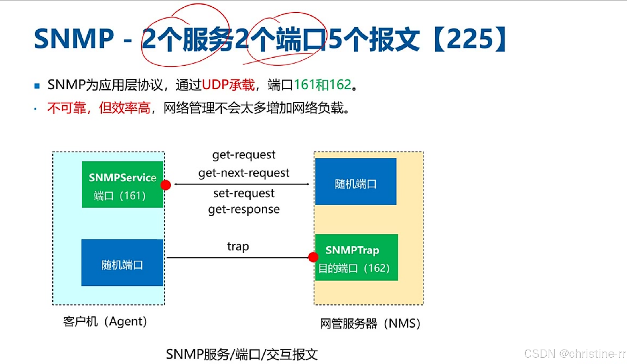 端口区分 | 161(被管设备接收请求)、162(网管服务器接收trap) | "非直接通信":随机端口↔161/162,考试仅考固定端口 | ★★★☆☆ |