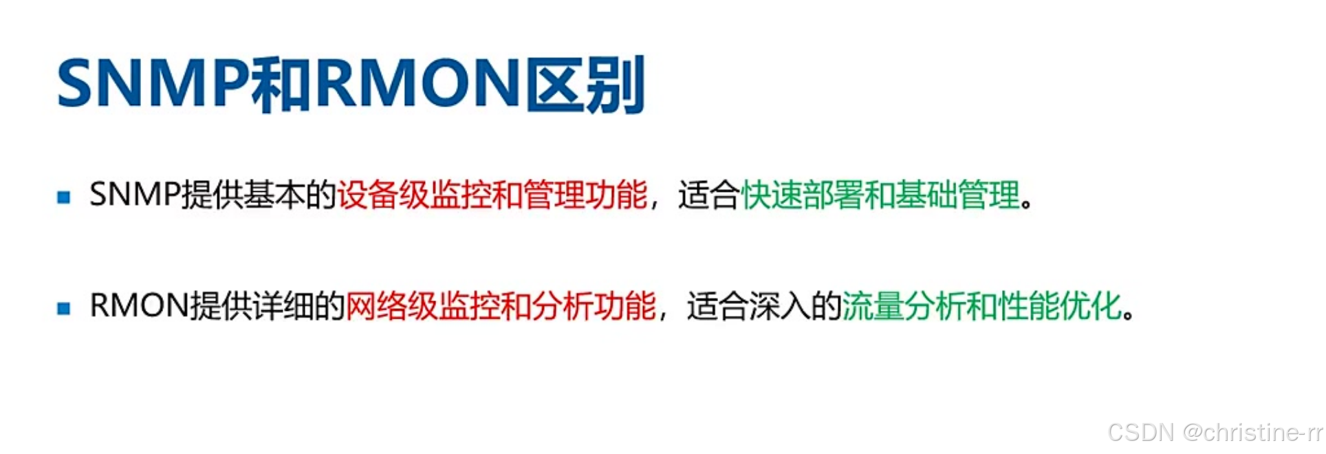 SNMP基础特性 | 应用层协议,UDP承载(端口161/162),无连接高效传输 | UDP头8字节 vs TCP头20-60字节,无三次握手开销 | ★★☆☆☆ |