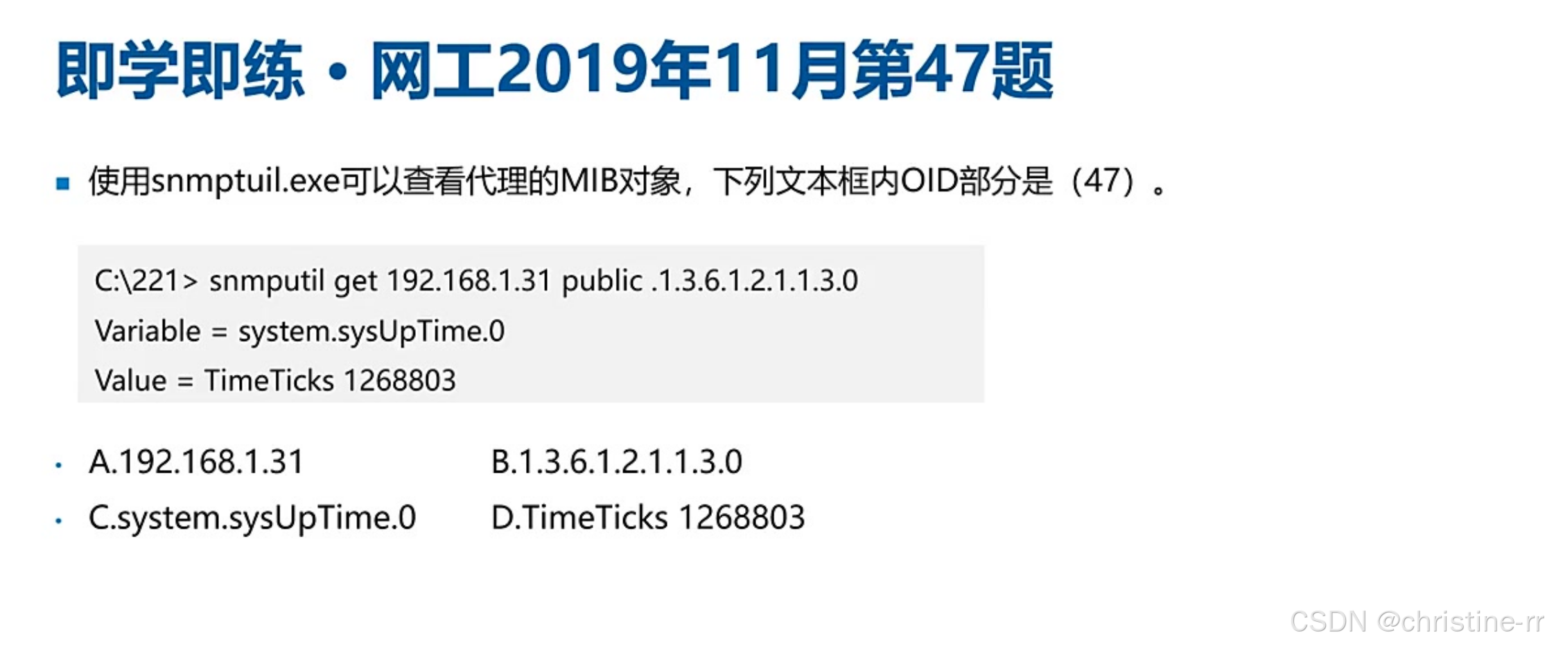 五大报文类型 | Get/GetNext/Set(管理端发起)、Response/Trap(代理端反馈) | Trap是唯一用162端口的报文,用于异常主动上报 | ★★★★☆ |
