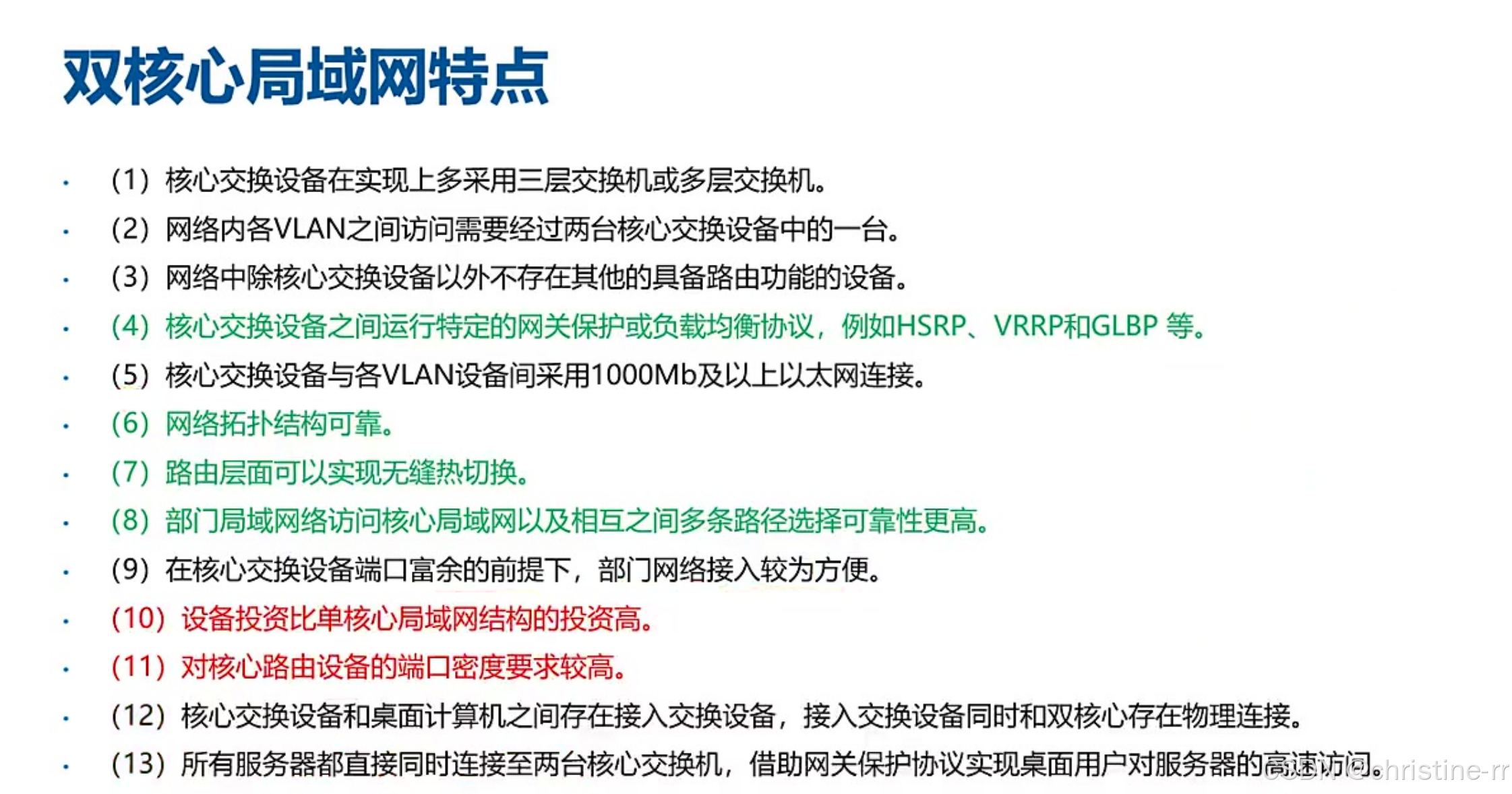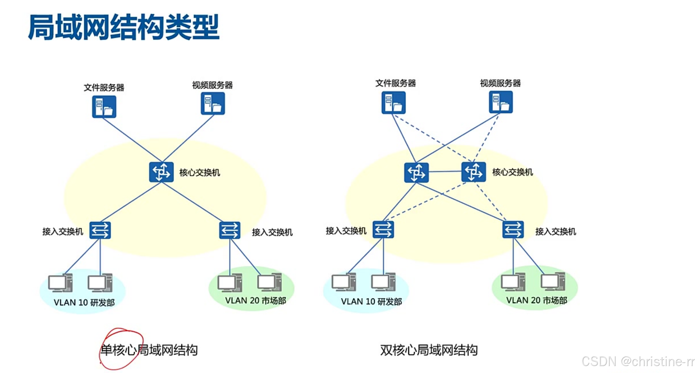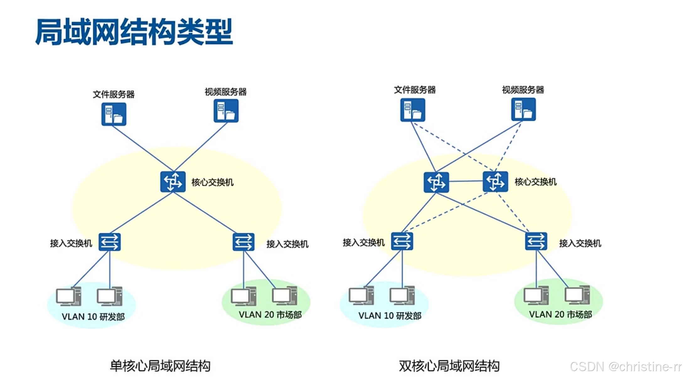 双核心局域网结构 | 两台核心交换机,接入层双上行,服务器双链路连接,运行VRRP/堆叠协议 | 优点:设备/链路冗余、无缝切换、多路径选择; 缺点:成本高、核心端口密度要求更高 | ⭐⭐⭐⭐ |