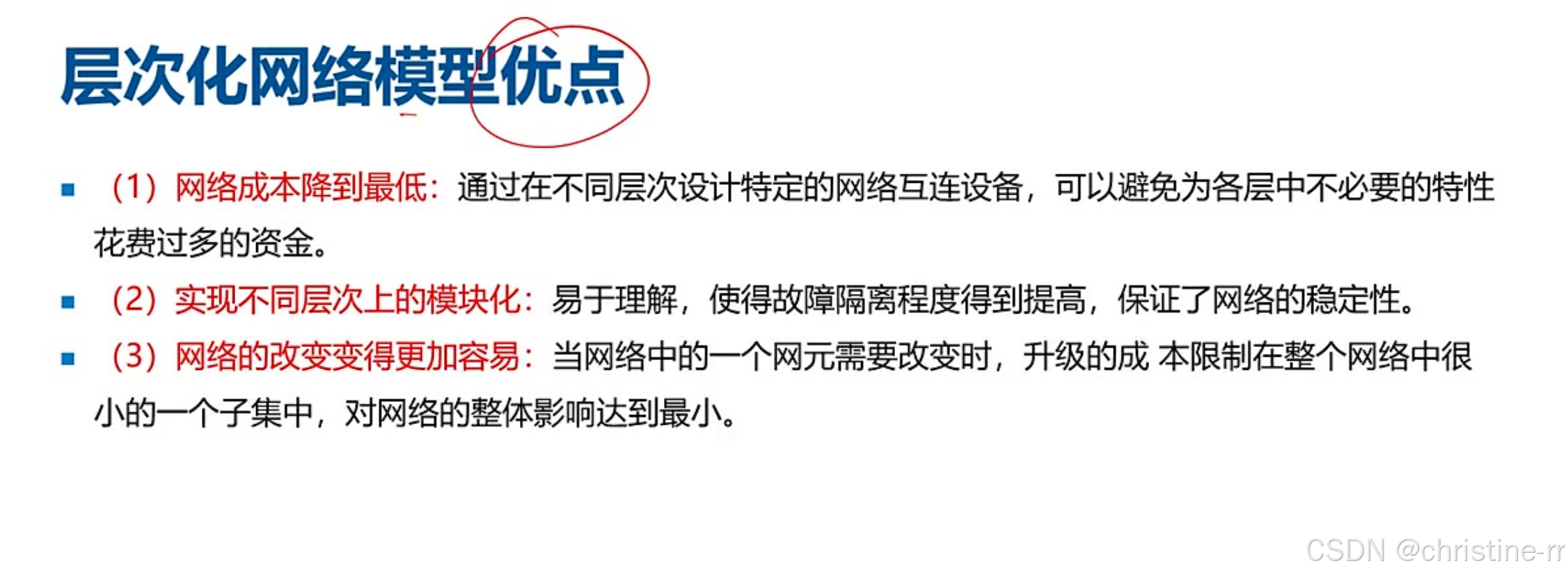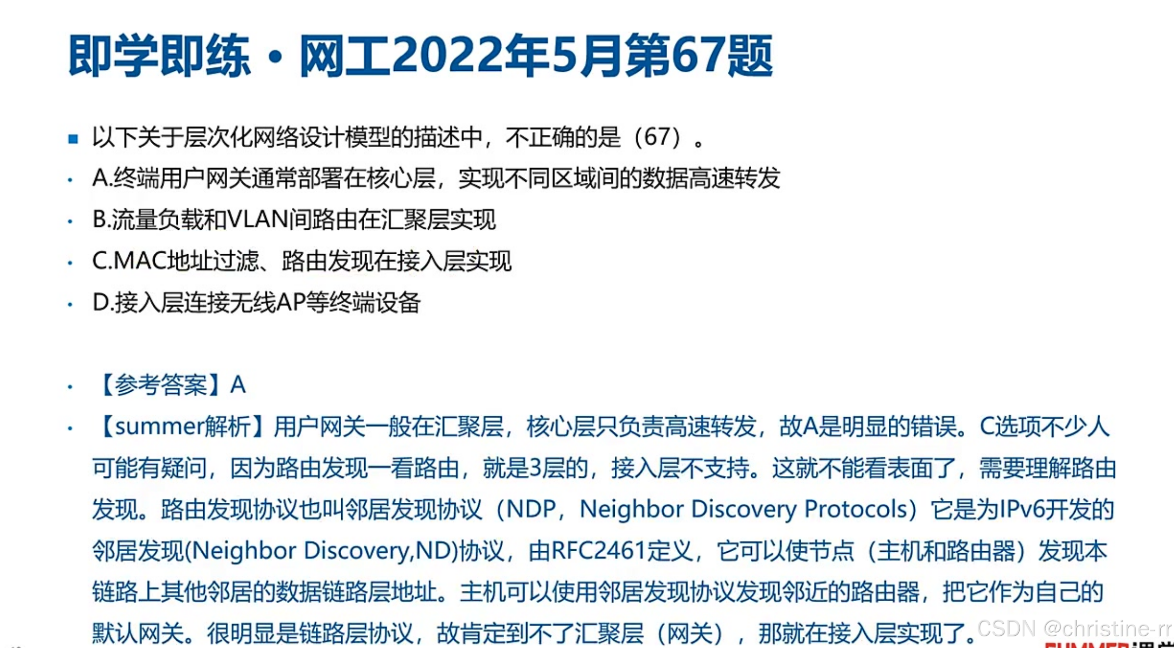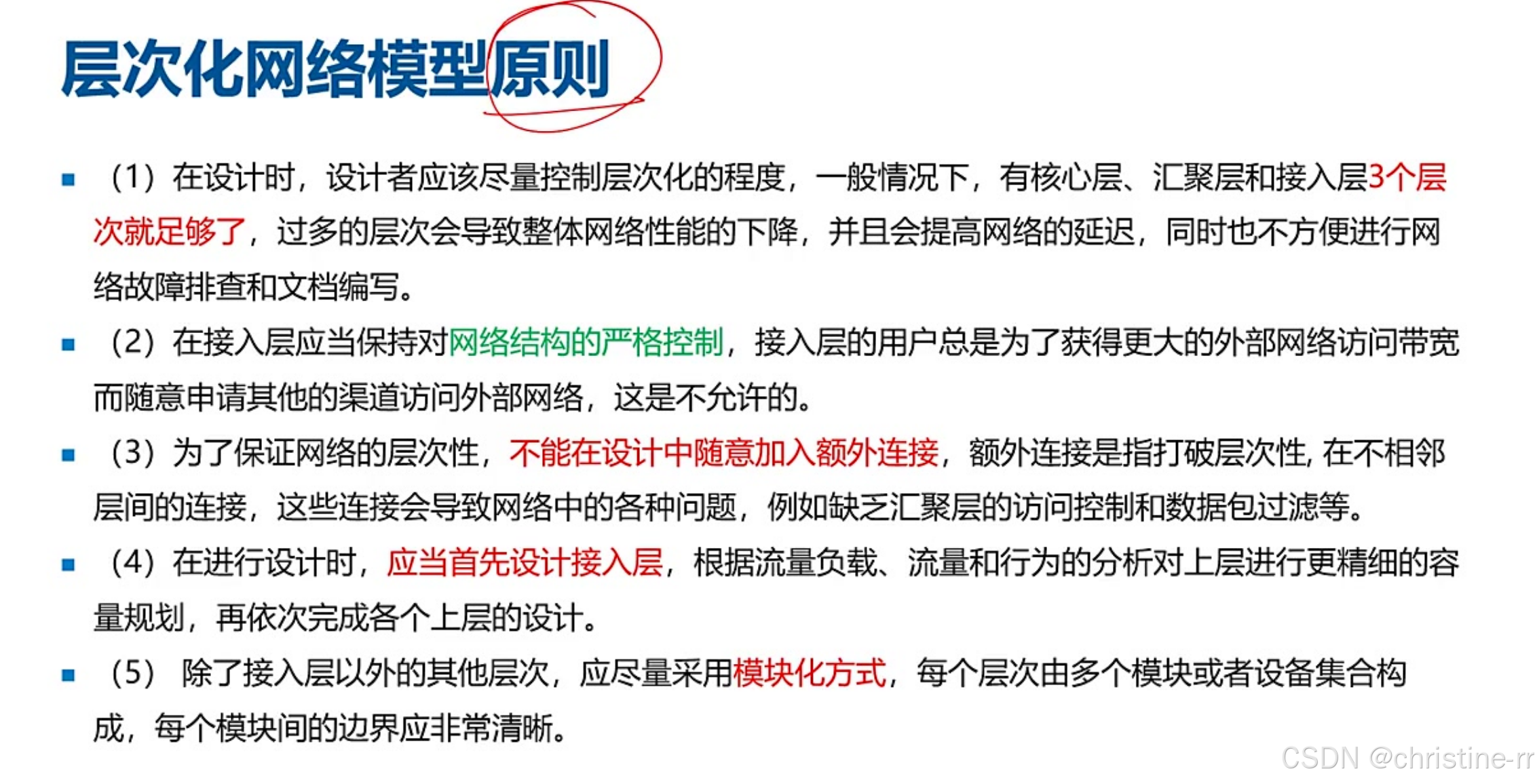 层次化设计原则 | 1. 控制为3层(接入-汇聚-核心); 2. 禁止接入层私接外部网络; 3. 模块化扩展 | 易错点: - 设计顺序:先接入层再上层; - 过多层次导致性能下降/故障排查困难 | ⭐⭐⭐⭐ |