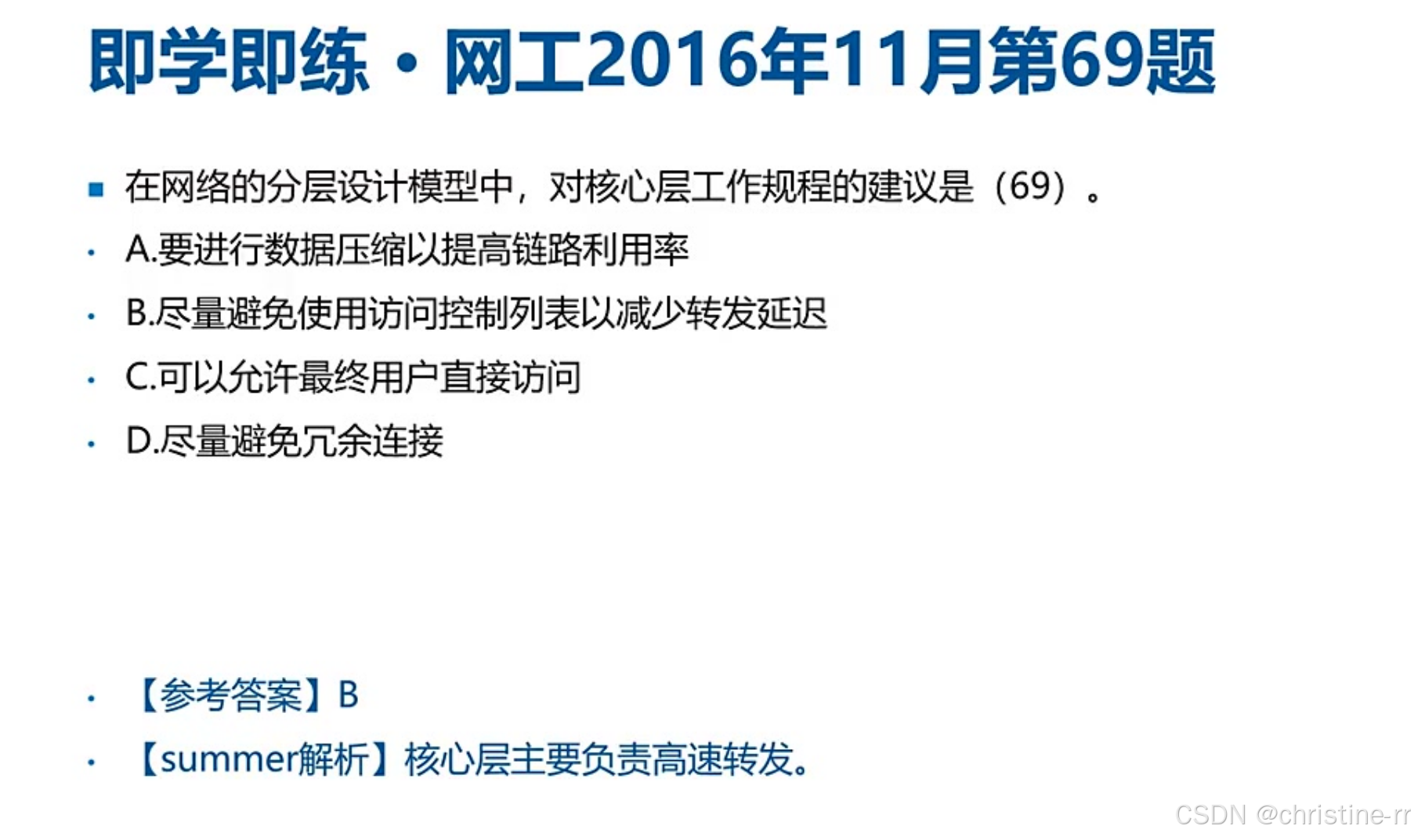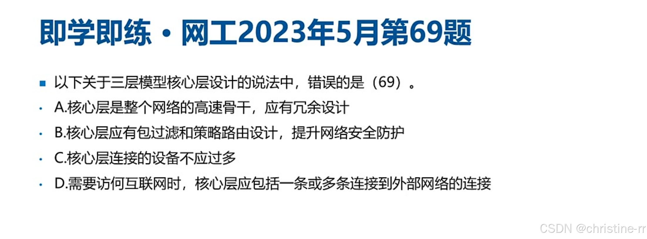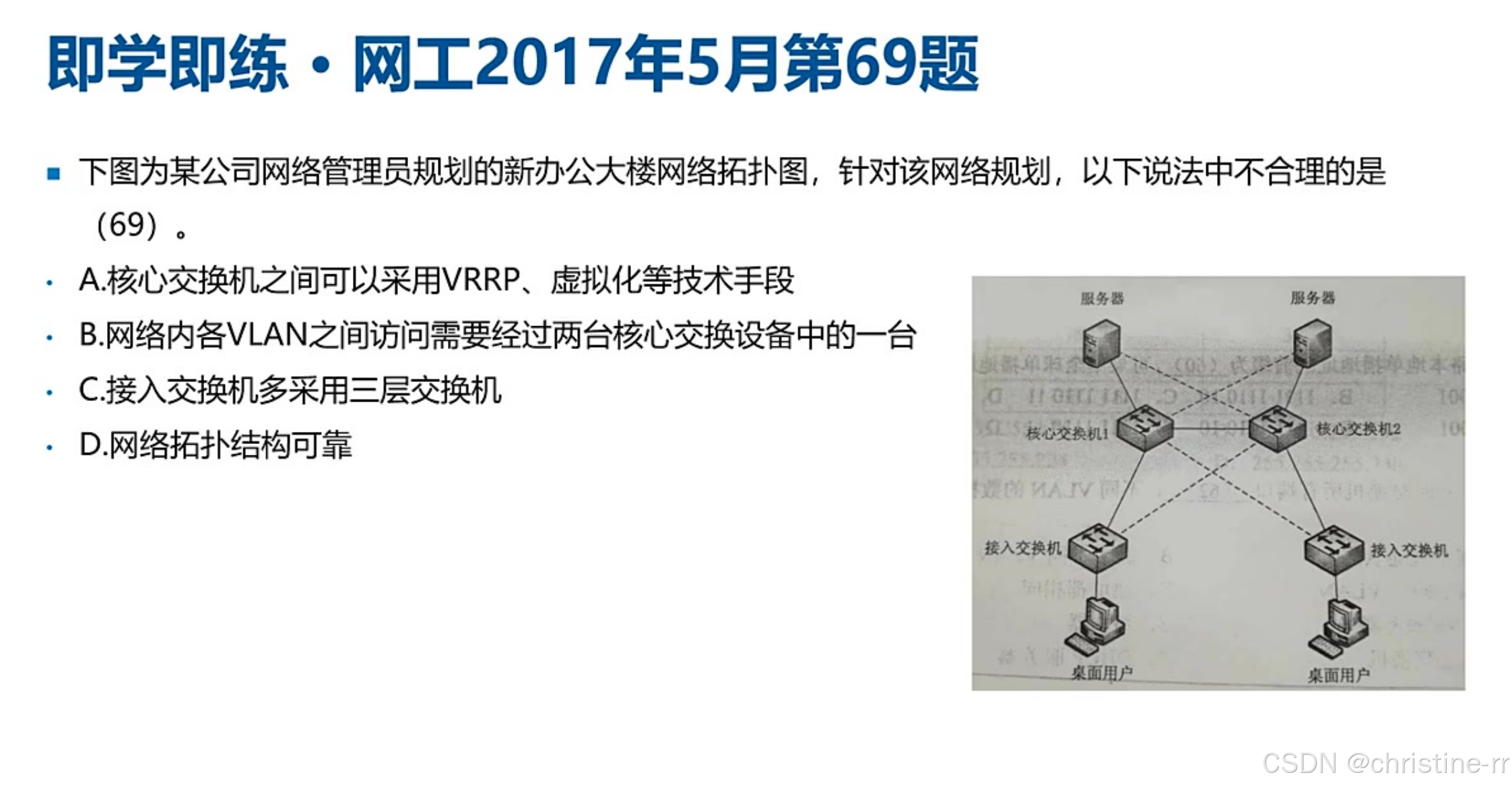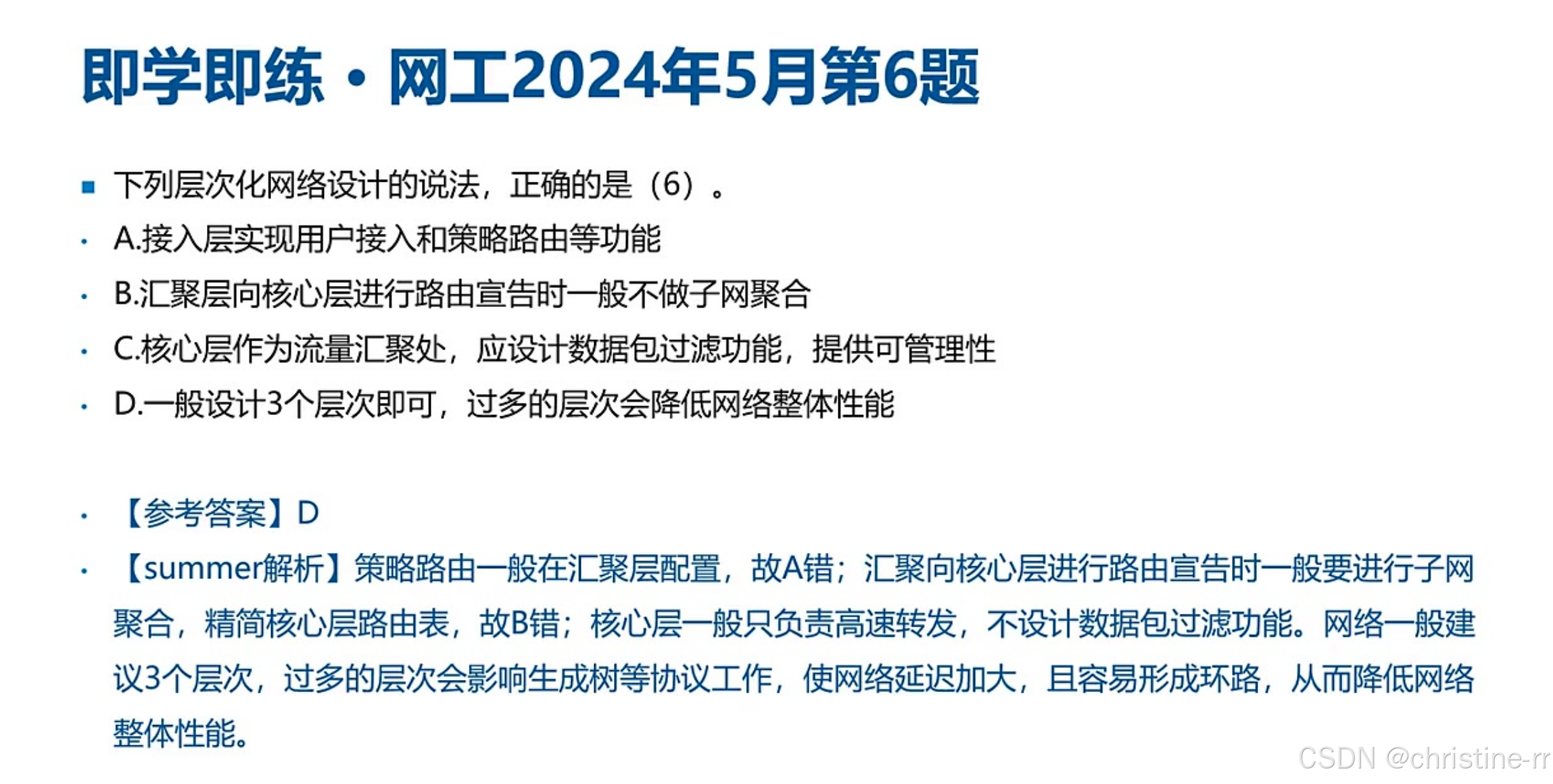 三层组网架构 | 接入层(用户接入/MAC过滤)、汇聚层(VLAN间路由/ACL)、核心层(高速转发) | 高频考点: - VLAN间路由在汇聚层实现; - 错误选项:核心层部署ACL/策略路由 | ⭐⭐⭐⭐⭐ |