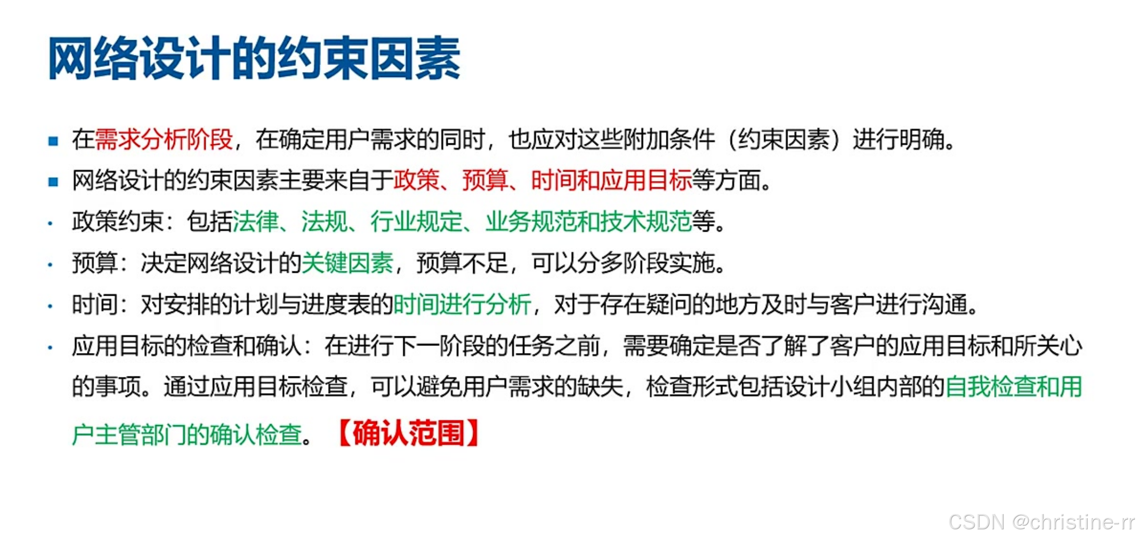 需求分析阶段 | 核心任务: 收集商业/用户/应用需求,输出需求说明书并签字确认; 最关键阶段(需求不明确会导致后续严重问题) | 重点:需求变更机制(范围/预算/时间约束)、约束因素(政策/预算/时间/应用目标) | ⭐⭐⭐⭐ |