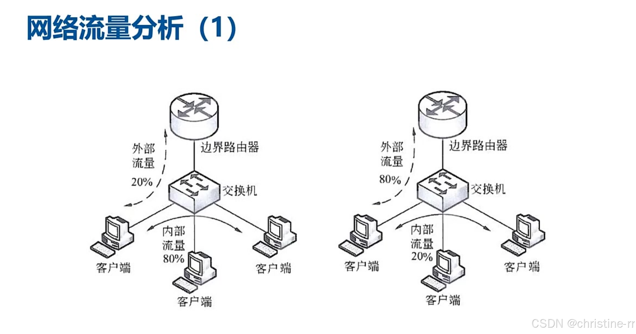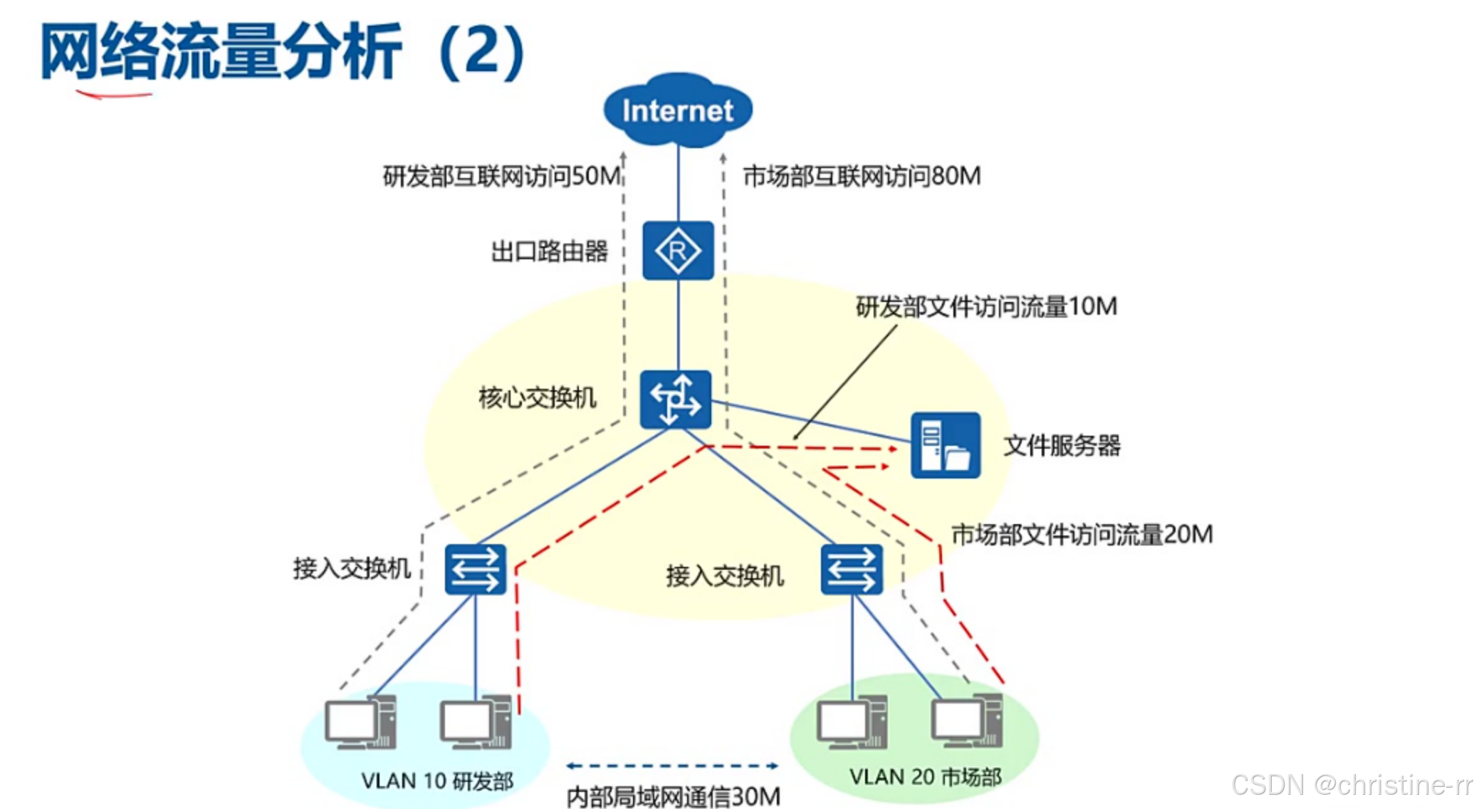 网络流量分析(八零二零原则) | 早期:80%内网流量,20%外网; 现代:80%外网流量,20%内网 | 应用案例:VLAN间流量统计(如研发部50M外网+10M文件服务器+30M市场部) | ⭐⭐ |