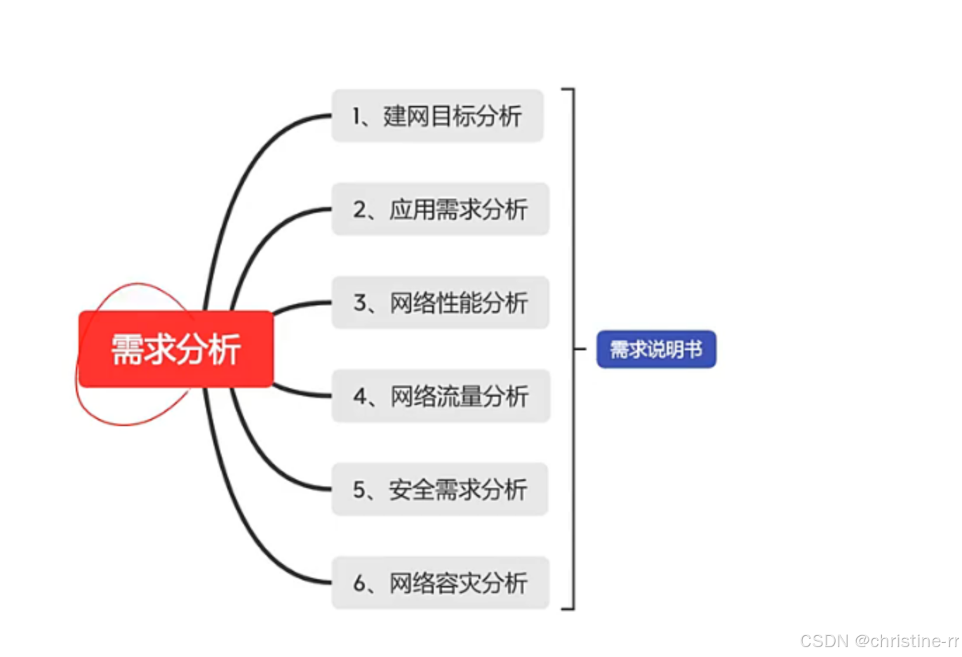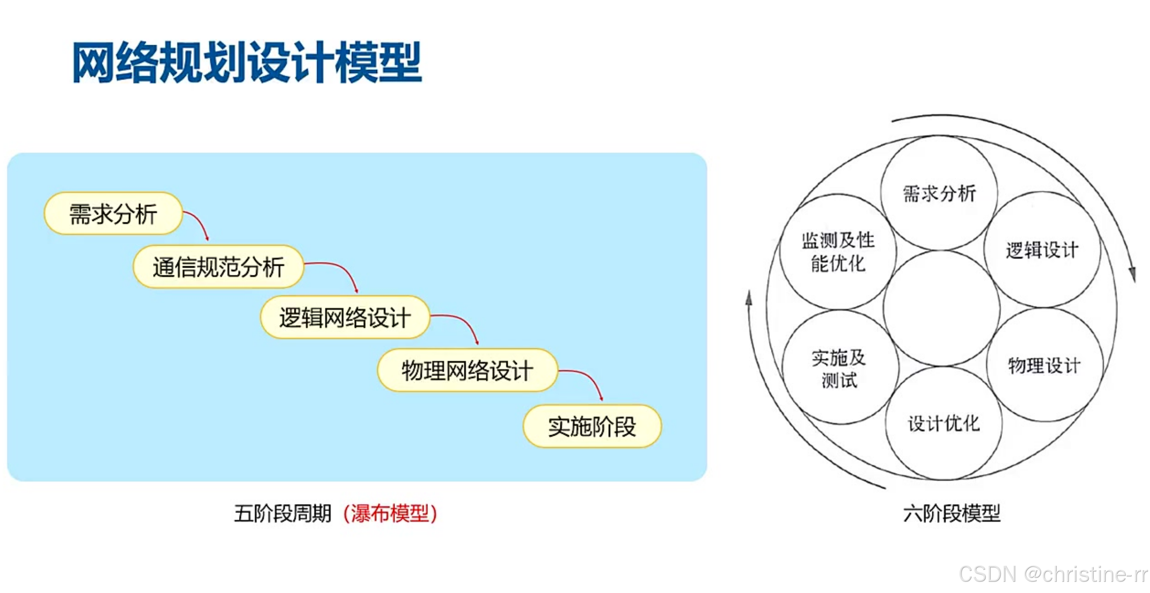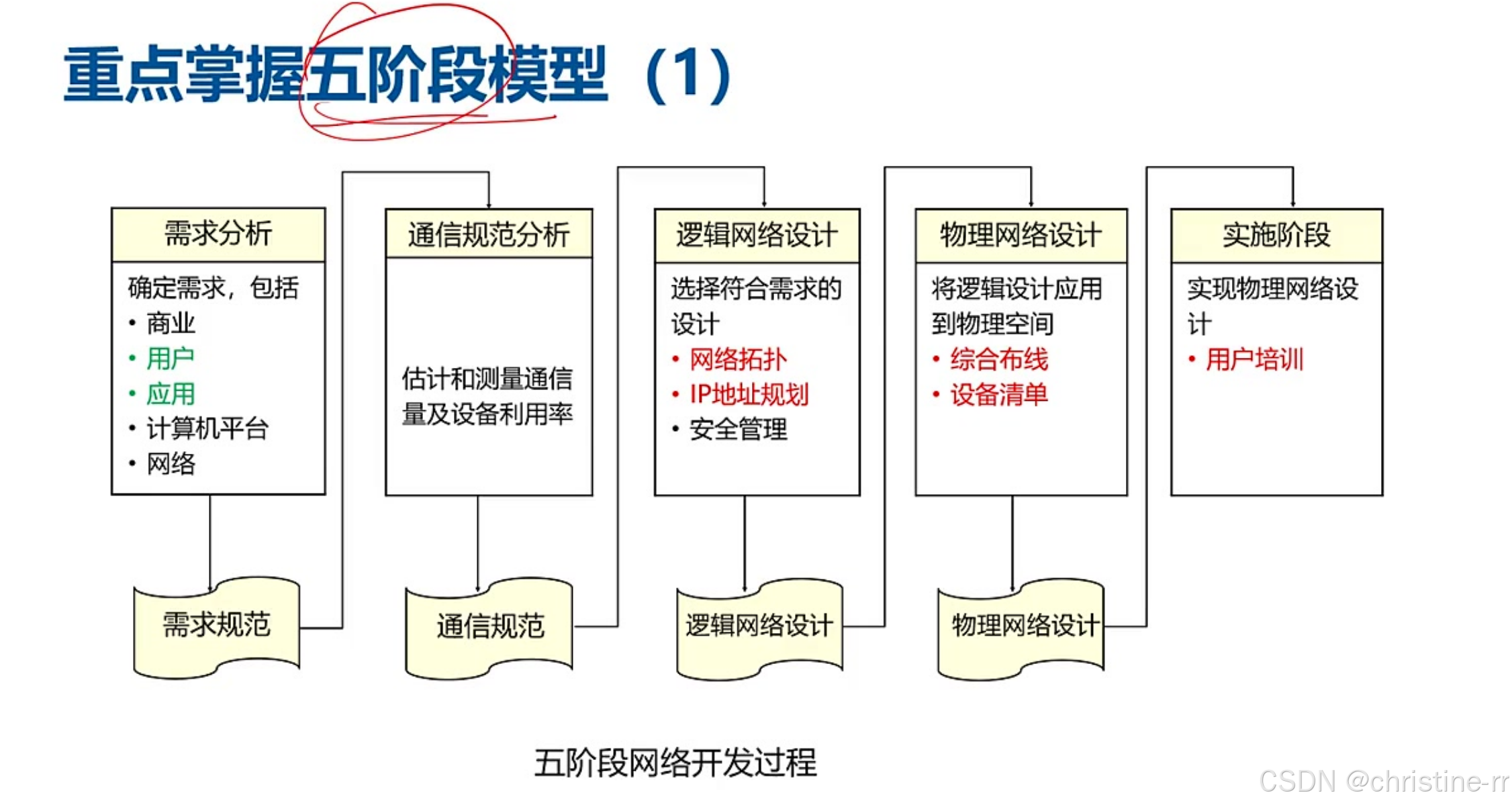 五阶段模型(瀑布模型) | 需求分析 → 通信分析 → 逻辑网络设计 → 物理网络设计 → 实施/运维; 线性执行,不可回溯 | 考试高频考点:阶段顺序、各阶段输出物(如需求说明书、逻辑设计文档) | ⭐⭐⭐ |