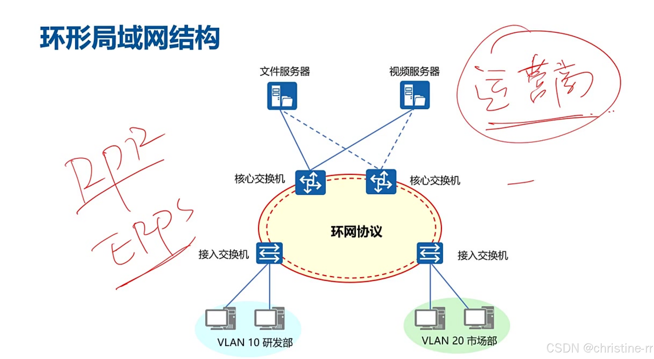 环形局域网结构 | 核心与接入设备环状互联(如RPR/ERPS),适用于运营商城域网或多校区互联 | 优点:50ms快速收敛、节省光纤; 缺点:投资较高、易形成环路 | ⭐⭐⭐ |