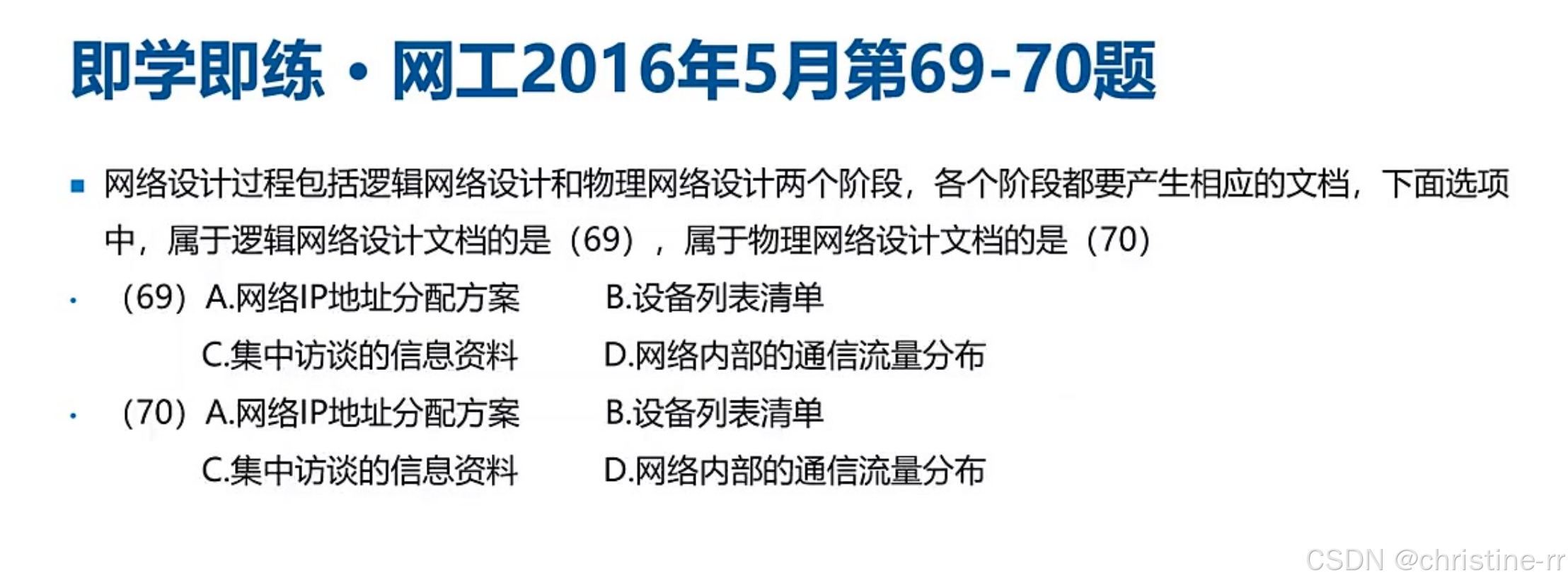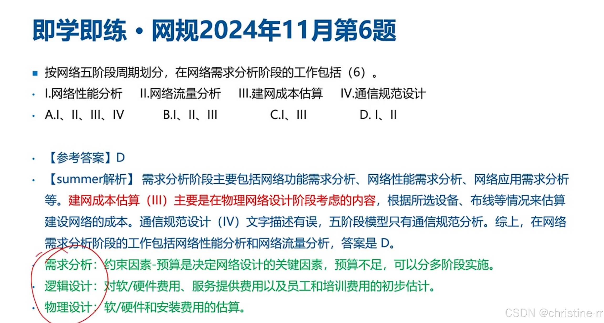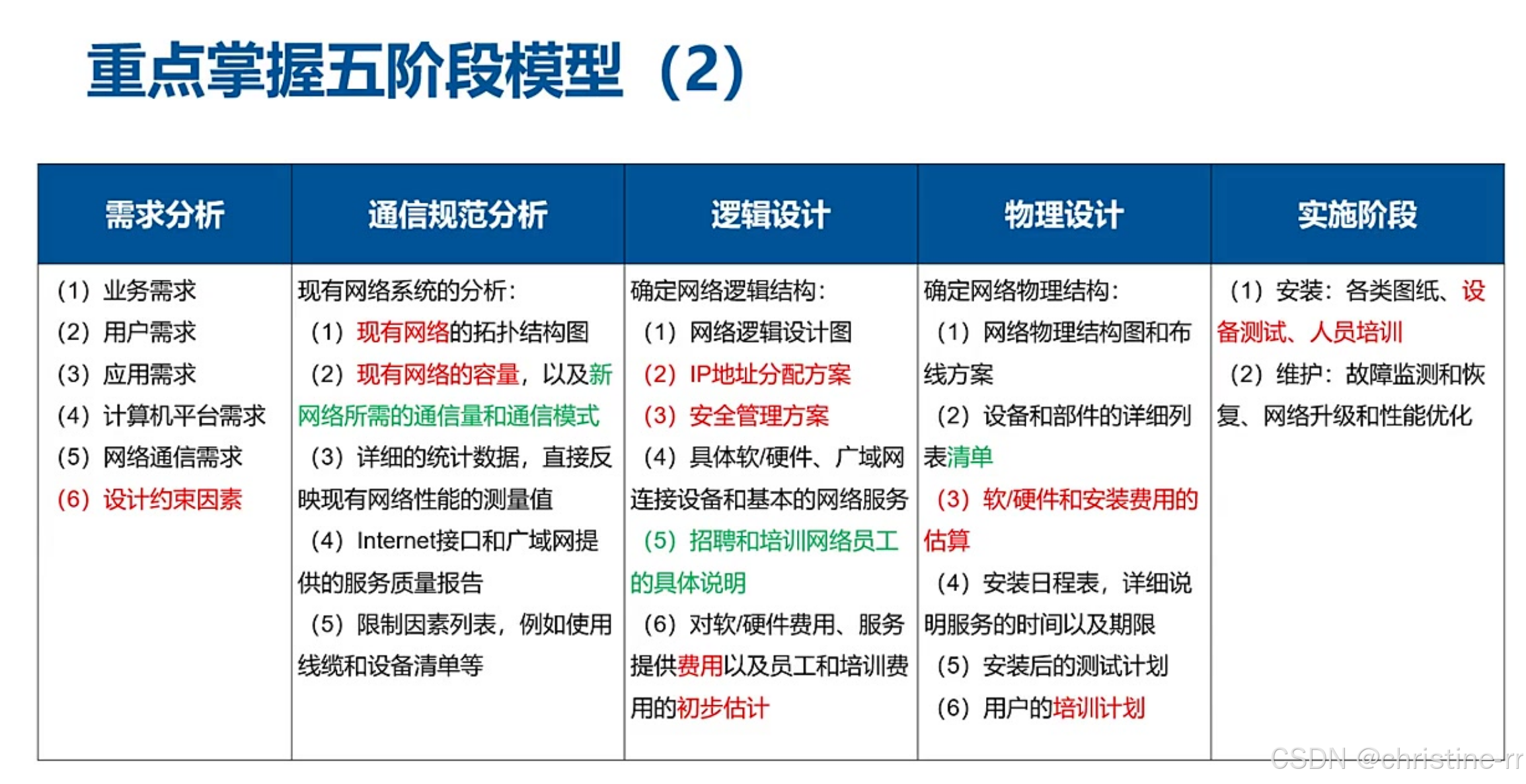 物理网络设计 | 将逻辑设计落地为设备清单、综合布线方案;含详细费用估算 | 易混淆点:培训计划(物理设计阶段制定,实施阶段执行) | ⭐⭐ |