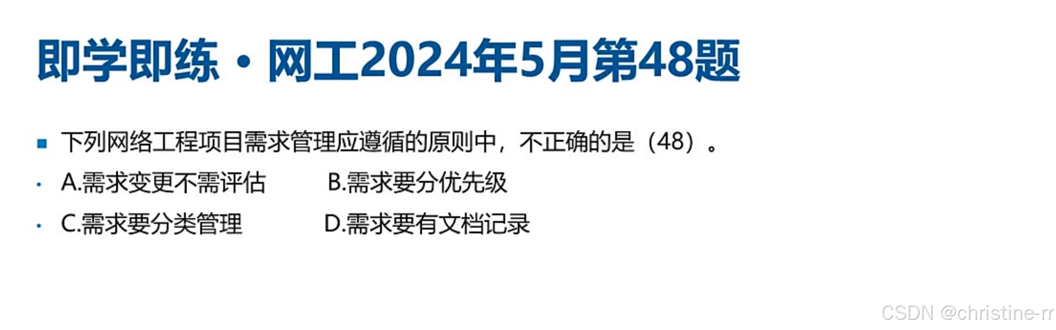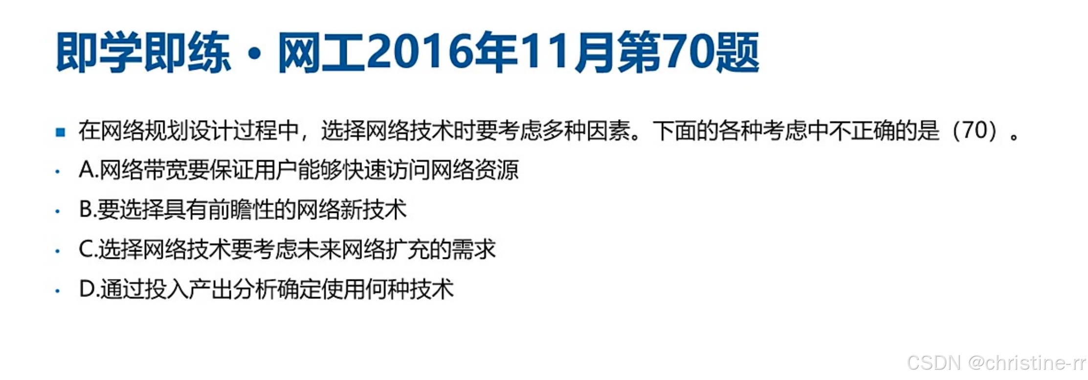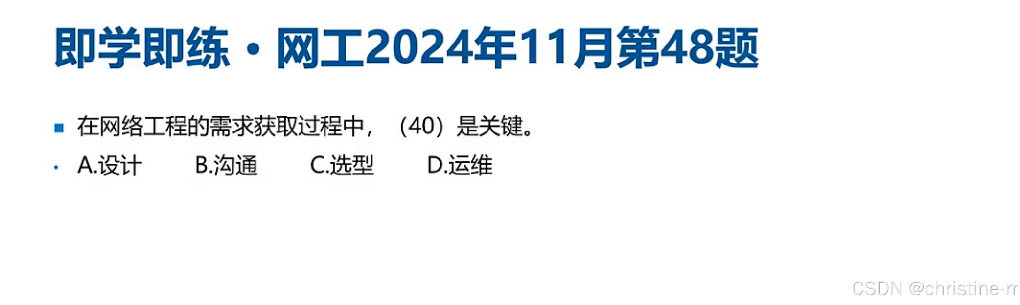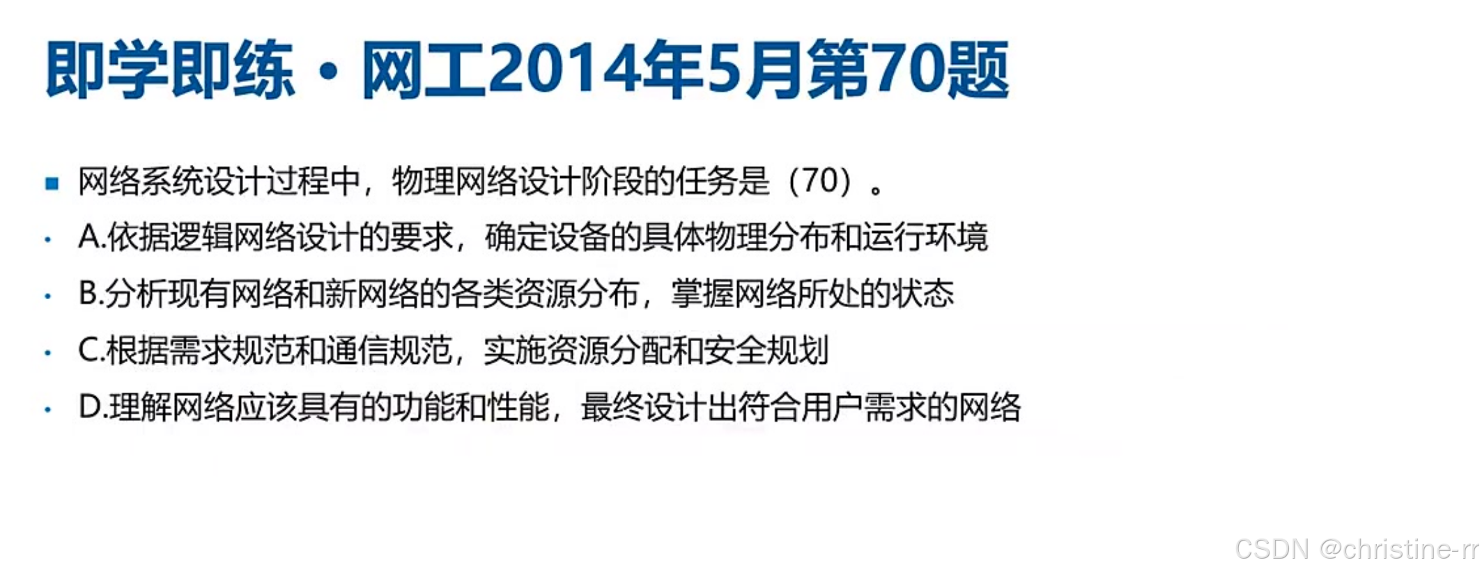 物理网络设计 | 将逻辑设计落地为设备清单、综合布线方案;含详细费用估算 | 易混淆点:培训计划(物理设计阶段制定,实施阶段执行) | ⭐⭐ |