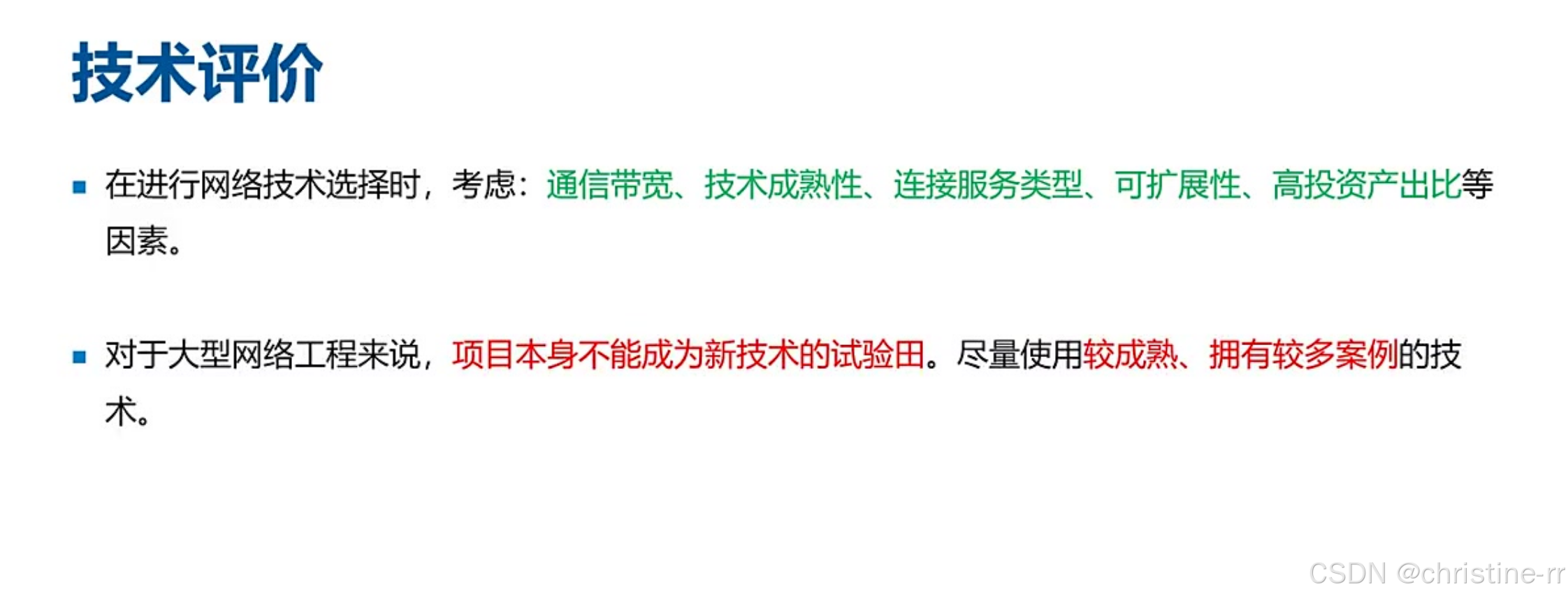 技术选型原则 | 大型项目禁用新技术试验,需选择成熟技术; 评估维度:带宽/扩展性/投入产出比 | 典型错误:盲目选择前瞻性新技术(需结合案例判断) | ⭐⭐⭐ |
