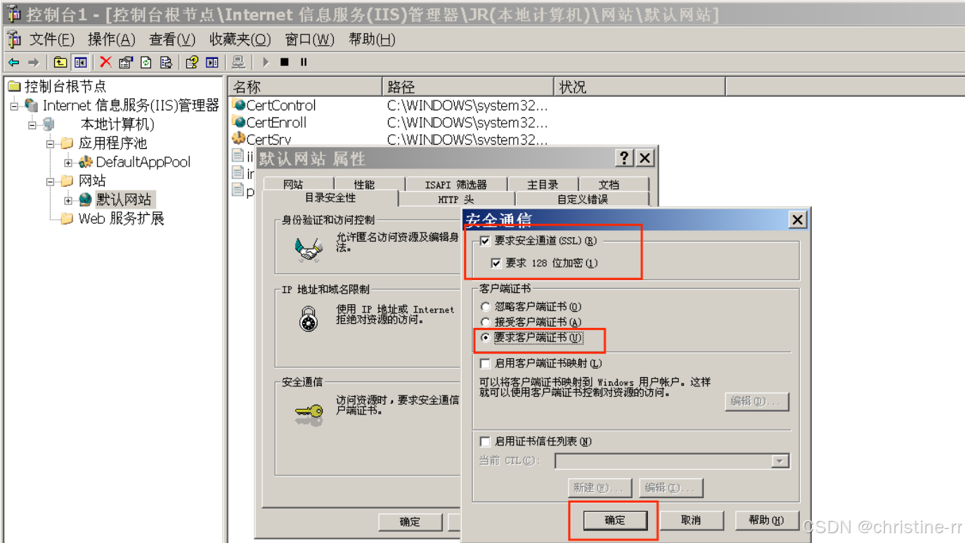 选上“要求安全通道”’和“要求客户端证书”,确定即可