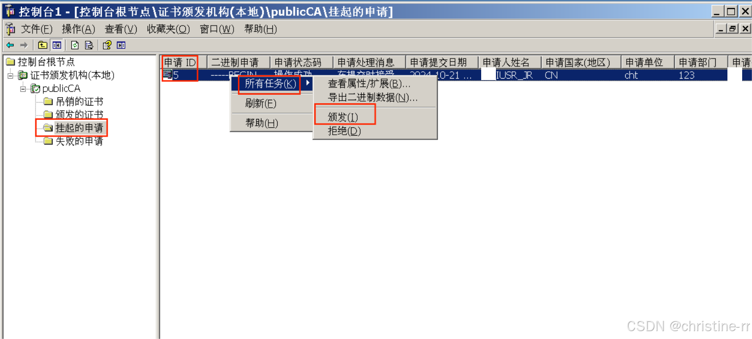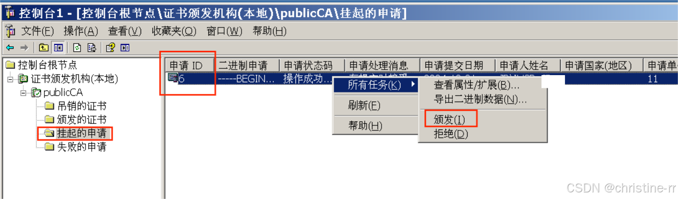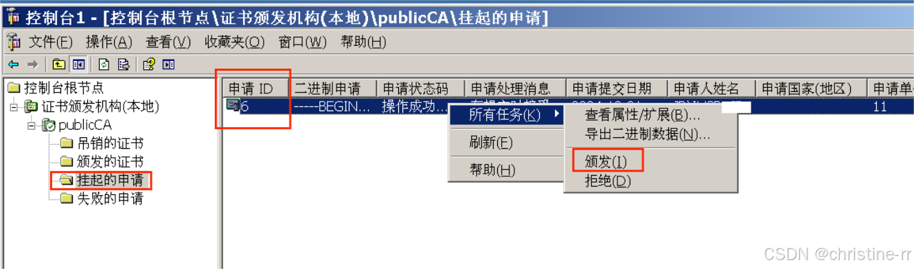 8.在证书服务器Windows Server2003上打开mmc控制台添加证书颁发机构,在挂起的申请处颁发申请ID为5的证书