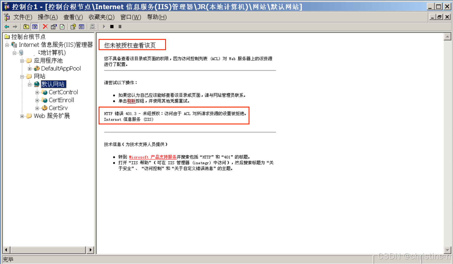 问题1:在“文档”,将index.html更改为“默认网站”的首页后,无法访问首页,出现“您未被授权查看该页”,“HTTP错误401.3-未经授权:访问由于ACL对请求资源的设置被拒绝”