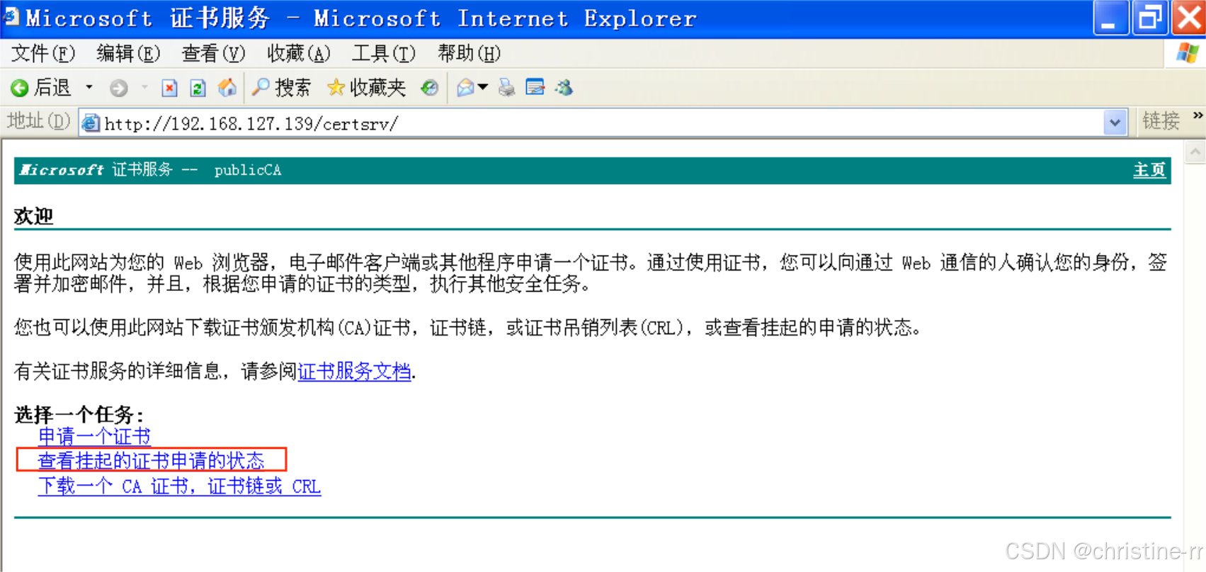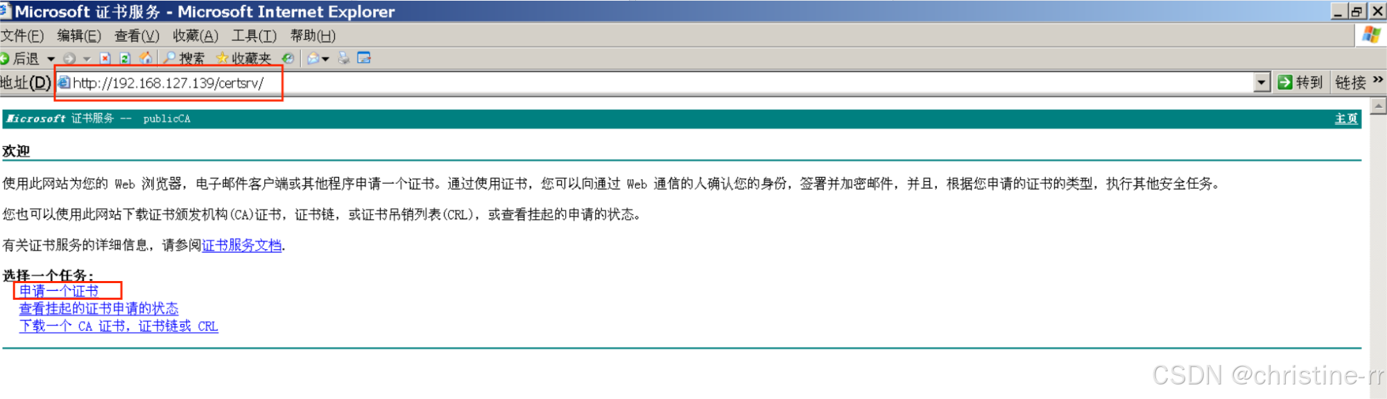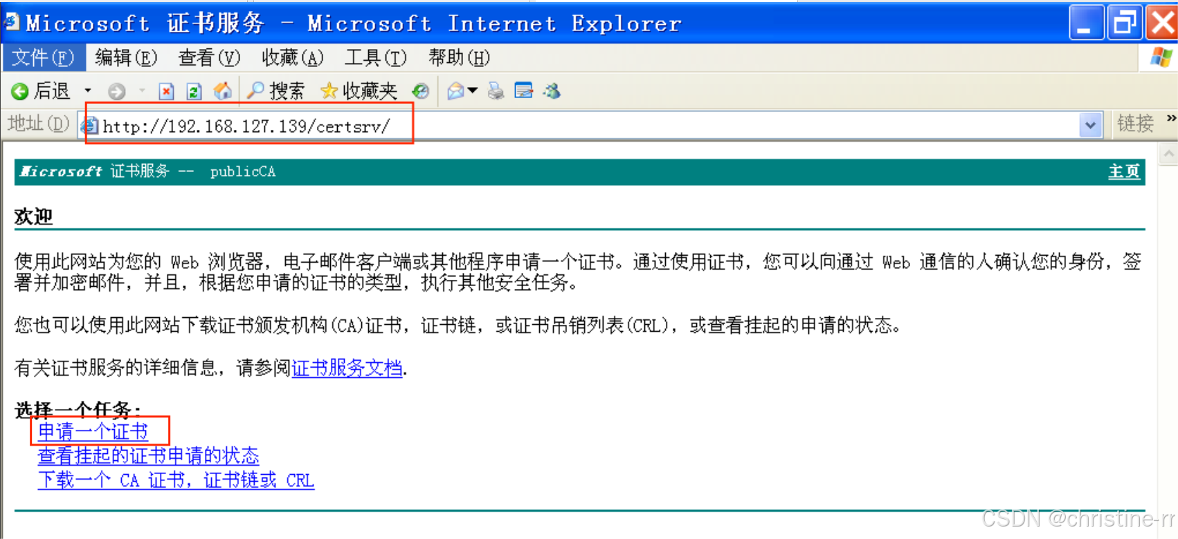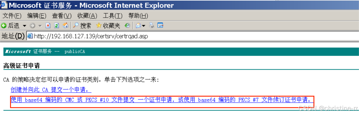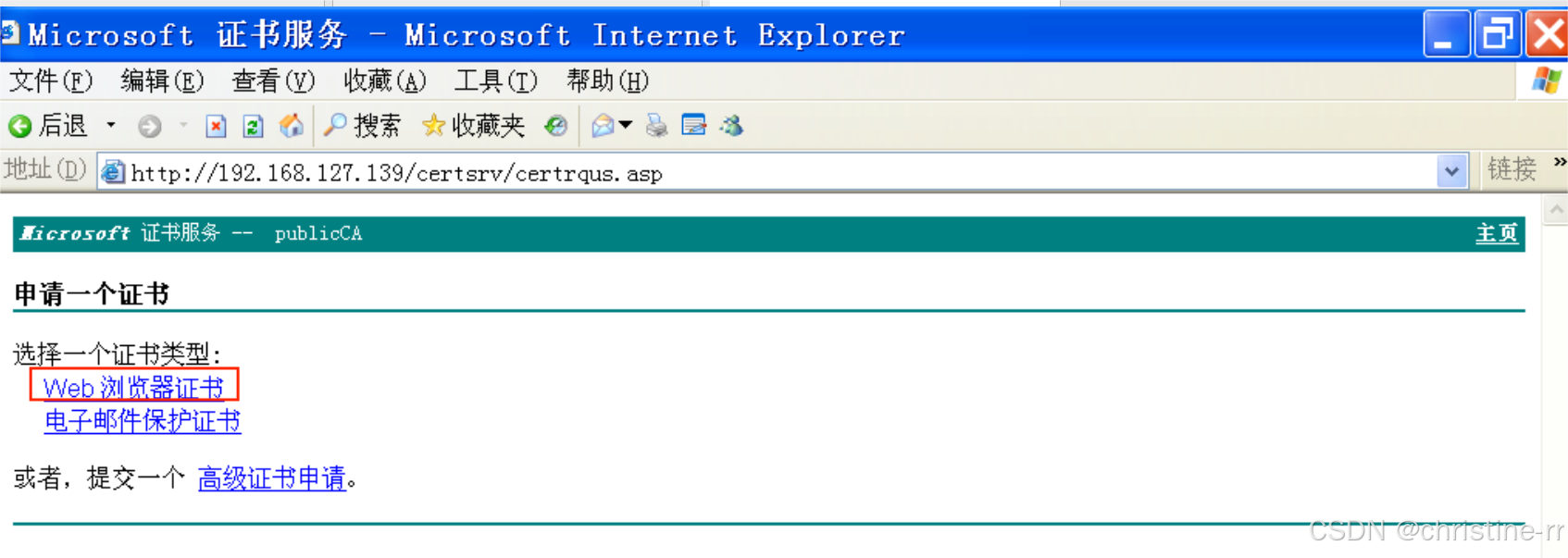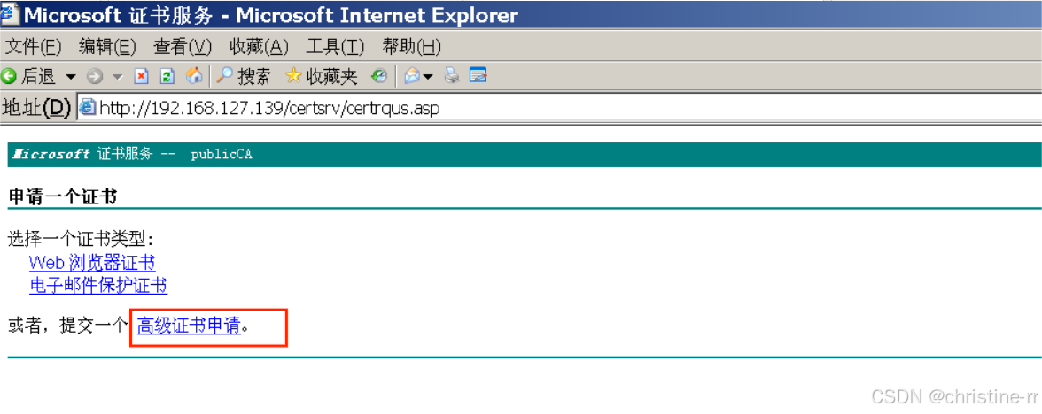 http://192.168.127.139/certsrv/192.168.127.139为证书服务器Windows Server2003的IP地址