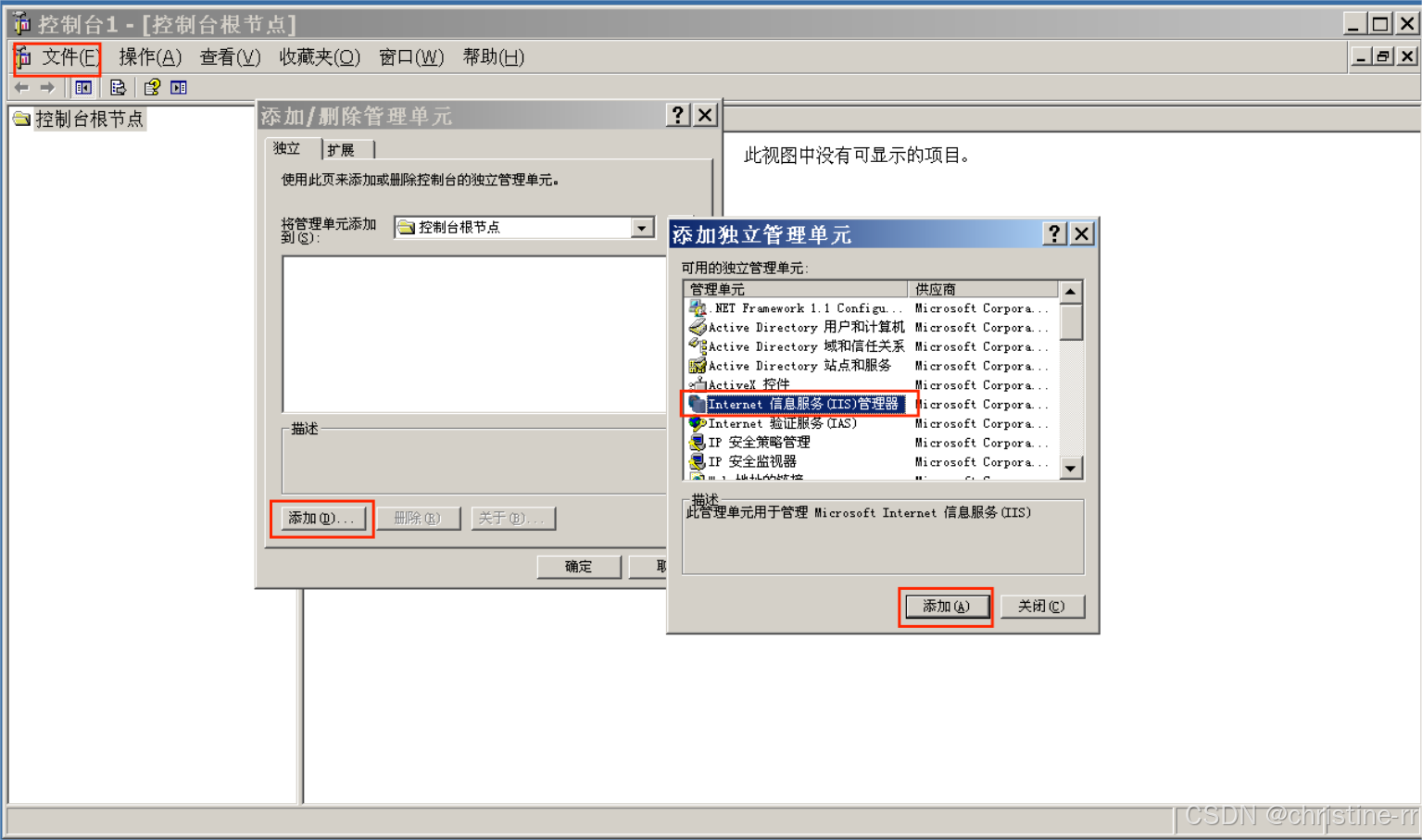 3.Win+R输入“mmc”进入控制台,右键“文件”添加管理单元,“添加/删除管理单元”——“添加”——勾选“Internet信息服务(IIS)管理器”,成功打开Internet信息服务(IIS)服务器