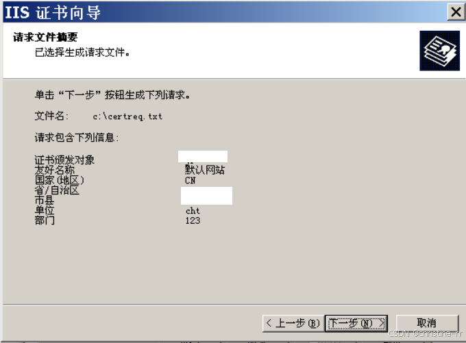 输入国家(地区),省份,市县,再下一步;在此注意一定要记住文件的路径,之后申请证书时,需要使用该文件的内容。下一步