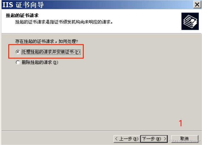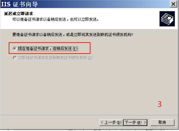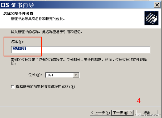 “现在准备证书请求,但稍后发送”,下一步;名称“默认网站”,下一步