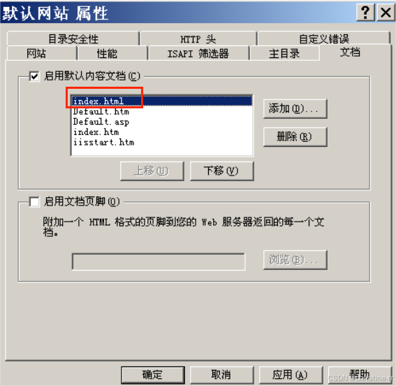 点击“文档”,在“启用默认文档内容”将index.html上移到顶端,作为默认网站的首页,完成点击“应用”再“确定”。