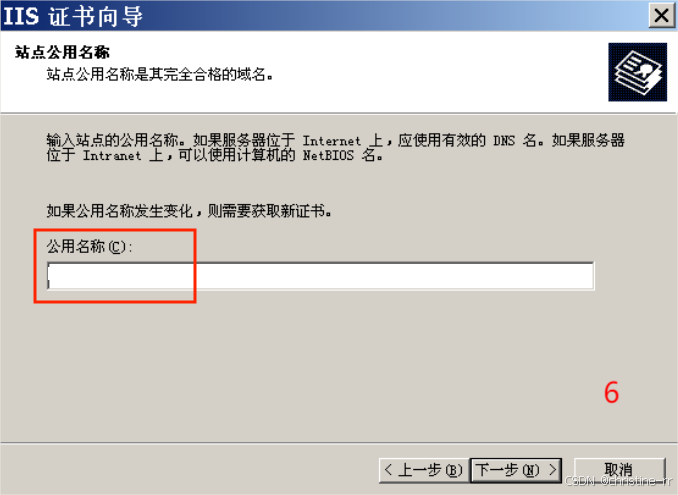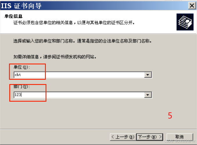 输入“单位”名称和“部门”名称,下一步;输入“公用名称”,再下一步