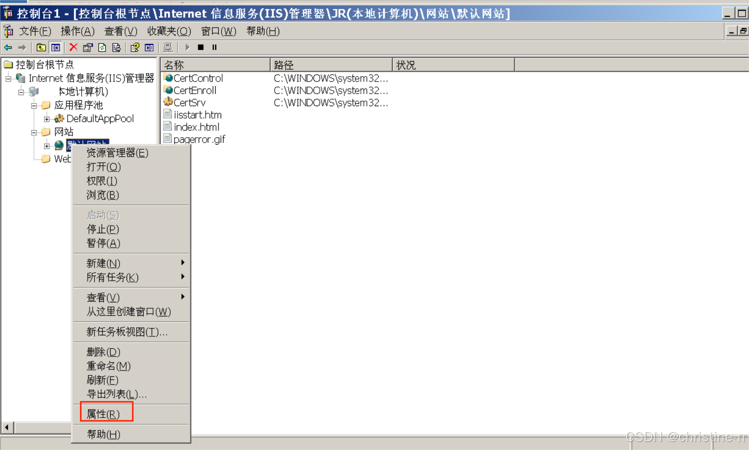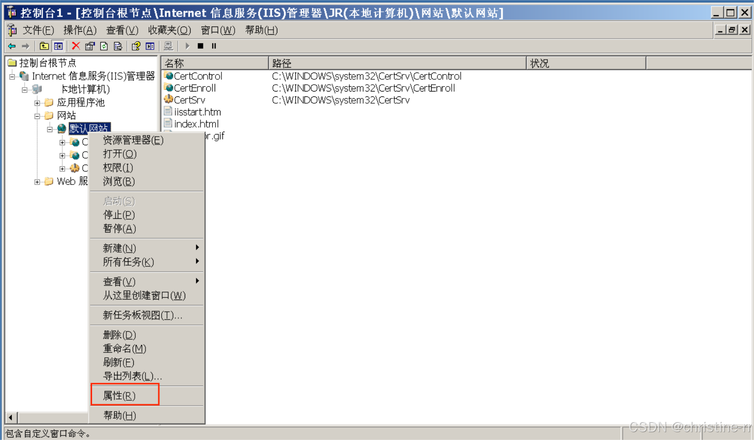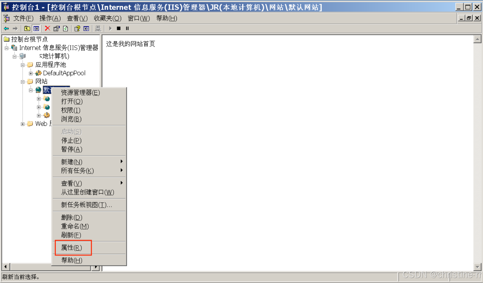 1.打开上述“默认网站”,右键点击选“属性”