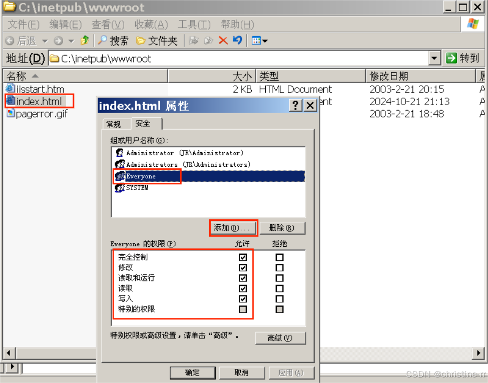 打开index.html文件所在的目录C:\inetpub\wwwroot,右键index.html选择“属性”,点击“安全”,在[组或用户名称]添加新的组名:Everyone,并勾选Everyone的所有权限