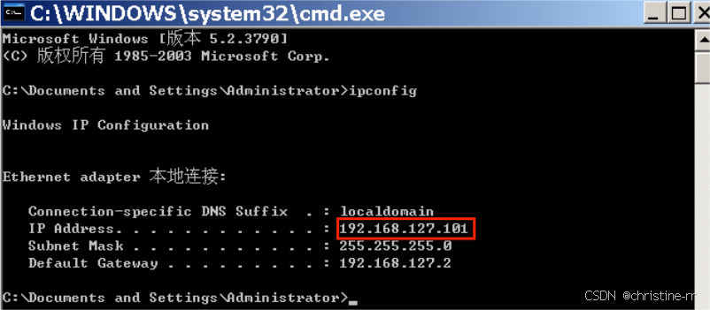 1.打开web服务器Windows server2003,win+R 输入cmd进入终端,输入ipconfig查看当前的IP地址:192.168.127.101和子网掩码:255.255.255.0