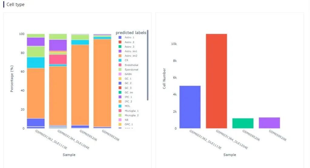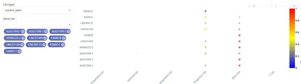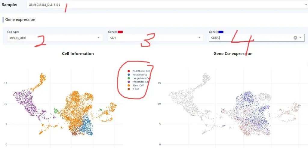 5:选择一个数据集进行分析:1.选择数据集。2:cell type 选择predict_label。也可以选择未注释的细胞群。3-4:查看两个基因的共表达情况,也可以查看一个基因的表达情况。