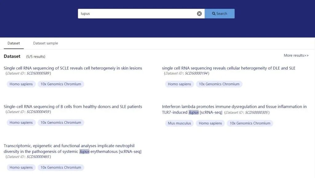 2. 在输入框查询lupus查询,一共的五个相关数据集,包括不同狼疮类型(SLE,DLE,SCLE)、细胞(B 细胞、中性粒细胞)与组织(外周血与皮肤)类型,因此这个网站的狼疮数据集还是比较多的。先前文章中单细胞数据库中的SLE数据集往往只有一个。