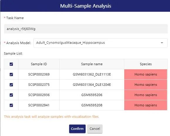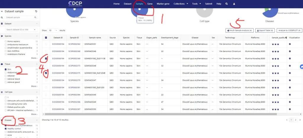 1:样本之间的差异分析需要注册后才能完成。然后在1-Sample模块中,2-选择组织skin,3-疾病Disease选择DLE与HC。然后4-选择需要选择的样本。这里选择了两个DLE,两个HC样本。5-选择Muti-Sample Analysis模块。