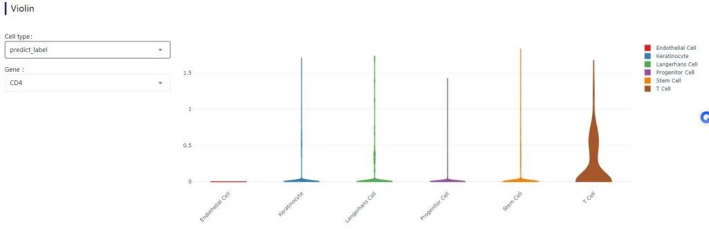 9:单个基因进行小提琴图可视化:输入单个基因,查看不同亚群下该基因的表达情况。