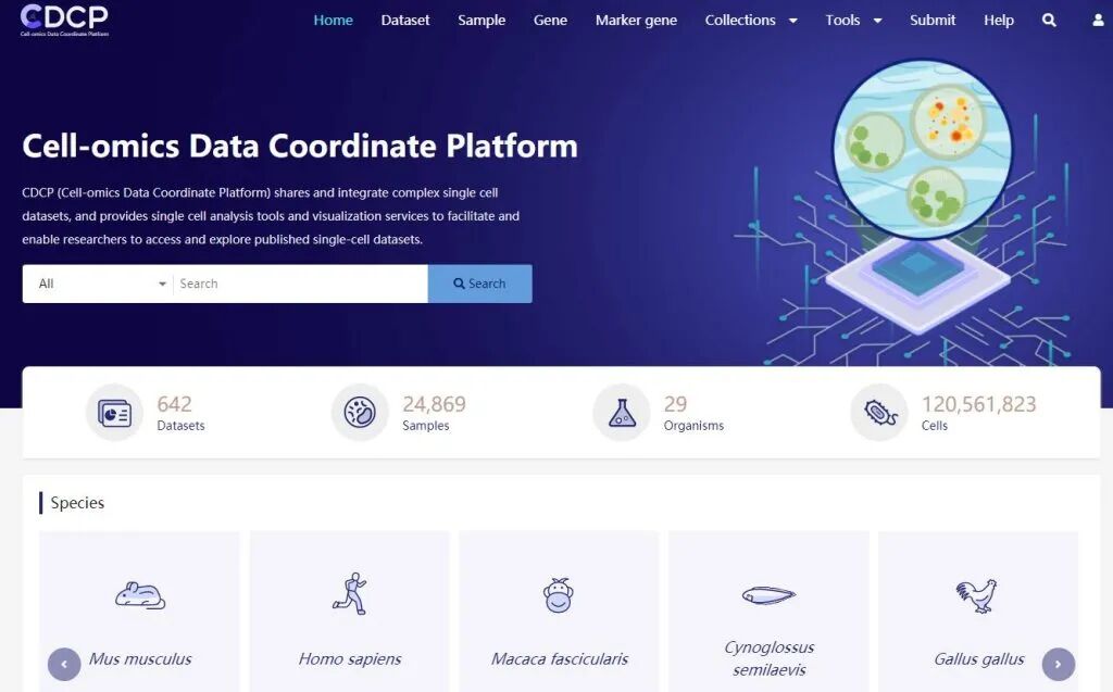 CDCP(Cell-omics Data Coordinate Platform,细胞组学数据协调平台)。这是一个非常优秀的国产单细胞数据库(https://db.cngb.org/cdcp/),由国家基因库生命大数据平台(CNGBdb)开发。
