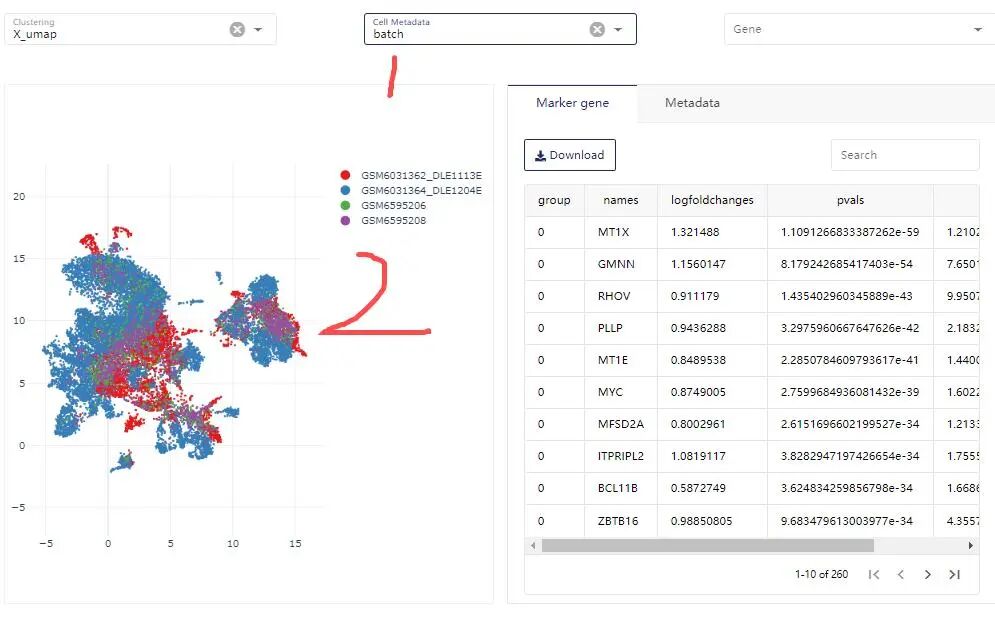 4:如图所示,将查看数据集模式,1-选择样本数据集展示模式。2-查看不同样本之间分群重复性。右侧是标记基因的在不同group(cluster)之间的富集程度。