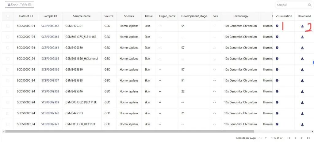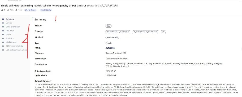 4:样本信息查看:介绍了这个DLE,SLE数据集的单个样本信息。如GEO来源,组织、年龄、测序平台、当时可以进行单个样本的可视化分析(1),也可以下载对应矩阵文件(2)。在这个页面下,只能进行单个样本的分析,无法同时进行对比分析或者多样本去批次分析。