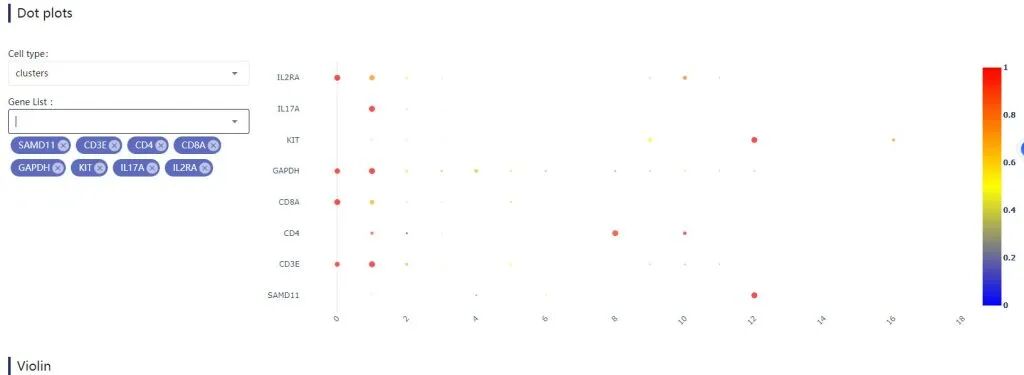 8:分析不同未注释细胞亚群中基因表达情况:由于许多情况下网站预测的细胞类型往往过于宽松或者不准确。因此,可以自行根据不同细胞亚群的标记基因来自定义不同的细胞亚群名称。因此可以将Dotplot模块下,选择clusters下,输入多个细胞标记基因,查看在不同cluster中的表达情况。