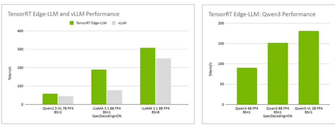 TensorRT Edge-LLM 与 vLLM 性能对比;TensorRT Edge-LLM 在多款 Qwen3 模型上的性能表现