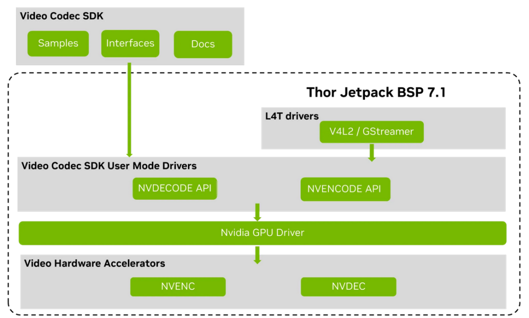 在多媒体处理领域,JetPack 7.1 带来了统一化的 Video Codec SDK,首次为 Jetson Thor 平台提供硬件加速的视频编解码能力。该 SDK 以 NVENCODE 和 NVDECODE API 为核心,提供了从基础接口到高级功能的完整工具链,包括可复用的 C++ 类、示例应用和详尽文档,支持实时 4K 视频编解码,完美匹配边缘场景中视觉感知的高带宽需求。