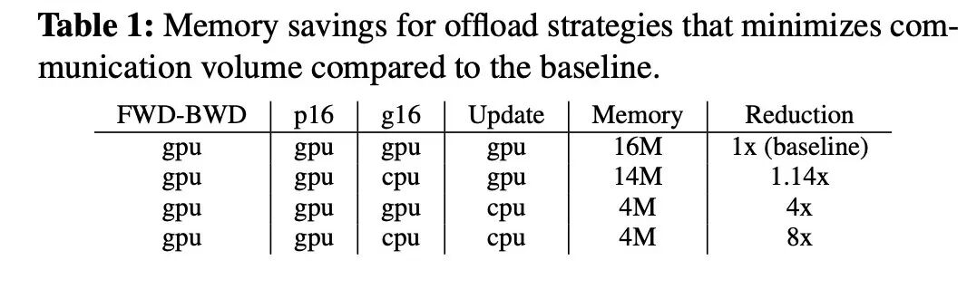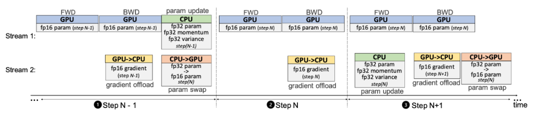这种设计使得单次迭代的 CPU-GPU 数据传输量仅为4M(2M FP16 梯度 + 2M FP16 参数,M 为参数数量)。