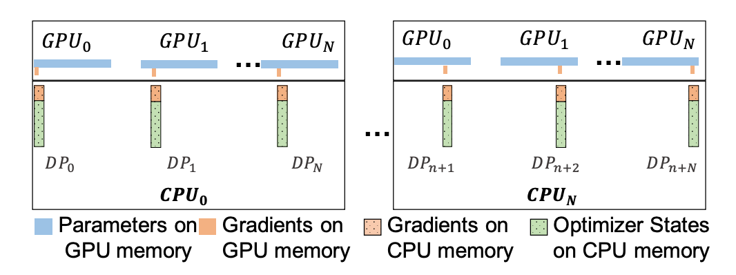 通过这种 “高复杂度任务 GPU 承担、低复杂度任务 CPU 承担” 的划分,ZeRO-offload 在利用 CPU 内存的同时,规避了 CPU 算力不足的问题。