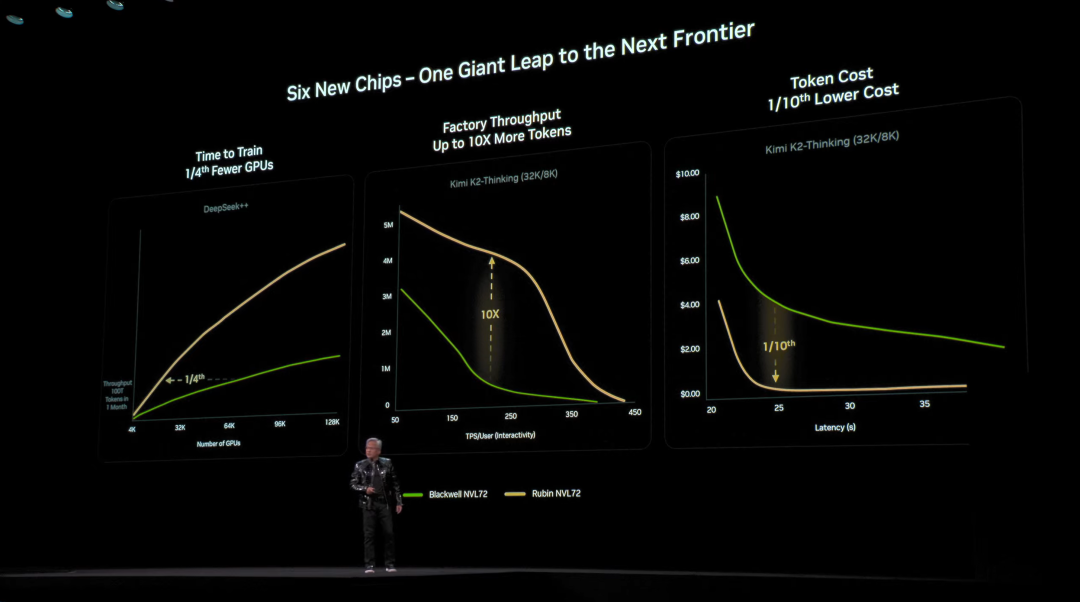 结果显示,在推理侧,Rubin平台单位token的推理效率提升最高可达10倍!同样的模型和响应延迟,算力成本可以直接下降到原来的1/10。