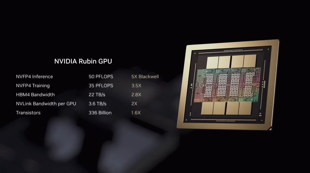 其中,Rubin GPU是整个平台的核心。它搭载第三代Transformer引擎,为AI推理提供50 PFLOPS的NVFP4算力。