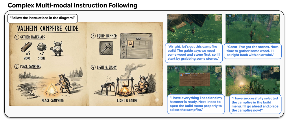 图3:通过使用Gemini,SIMA 2可以实现更复杂推理能力。例如上图的智能体成功利用复杂图表完成搭建营火的多步骤任务。整个过程中,智能体持续沟通其当前行为和下一步计划。