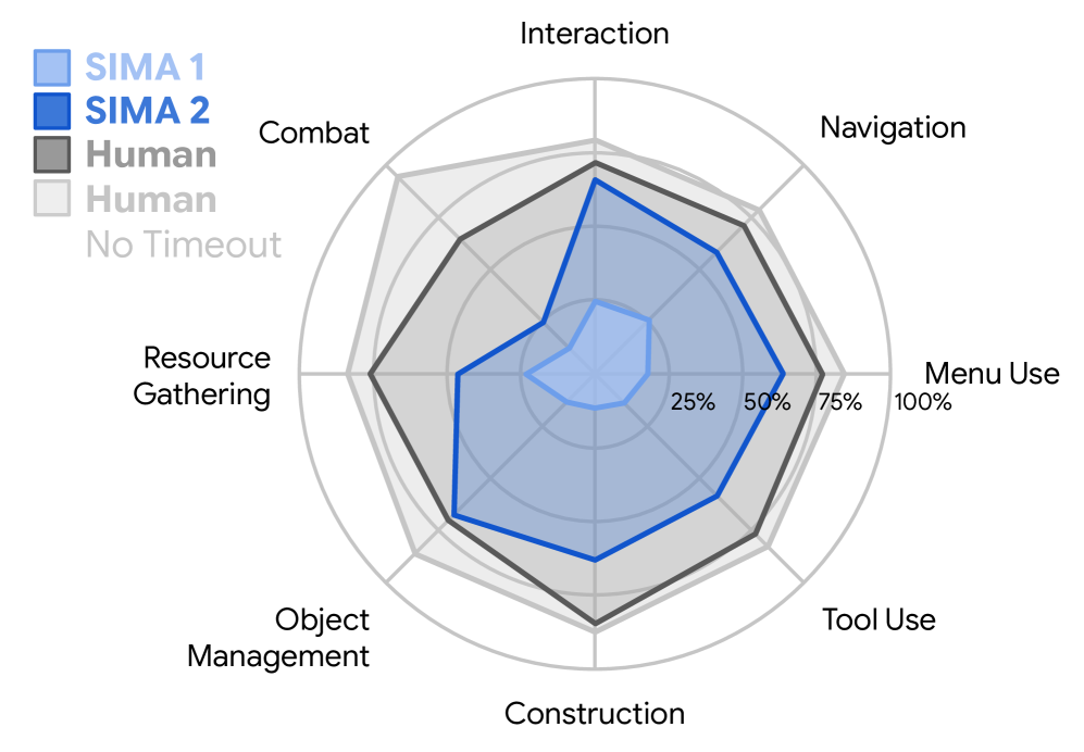 图5:SIMA 2在多个技能类别中显著优于 SIMA 1。在交互和物体管理等类别中,SIMA 2的表现几乎接近人类水平。然而,在资源收集和战斗等其他类别中,SIMA 2 仍有提升空间。