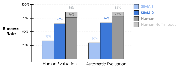图4:在所有训练游戏环境中中,SIMA 1、SIMA 2 和人类的任务完成成功率对比,SIMA 2相比SIMA 1平均成功率翻倍,在人类和自动评估时下均接近人类水平。