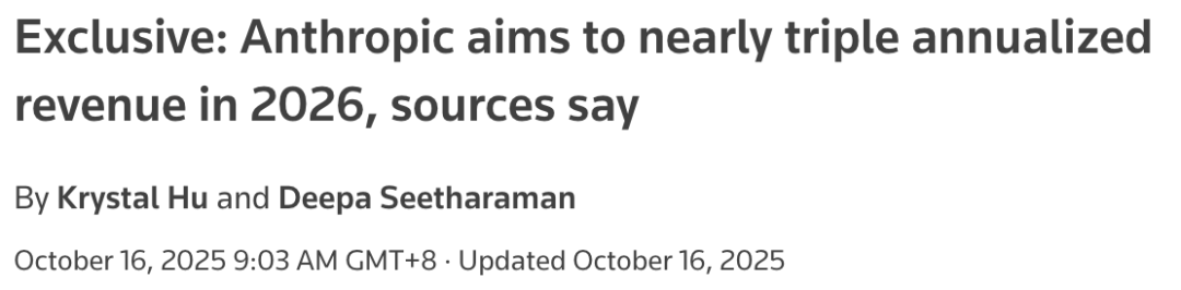 据路透社报道,知情人士透露Anthropic有望在2025年底前实现内部设定的90亿美元年化营收目标,并预测其2026年年化营收增长将接近3倍,目标区间约为200–260亿美元。