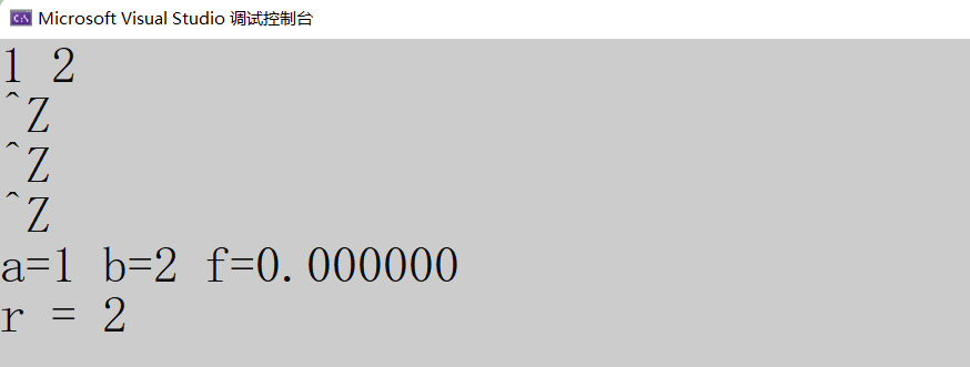 在VS环境中按3次 ctrl+z ,才结束了输入,我们可以看到r是2,表示正确读取了2个数值。 如果⼀个数字都不输入,直接按3次 ctrl+z ,输出的r是-1,也就是EOF。
