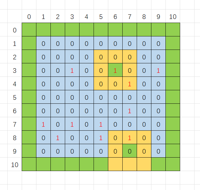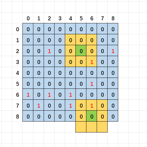 假设我们排查(2,5)坐标时,我们访问周围的一圈8个黄色位置,统计周围雷的个数为1。