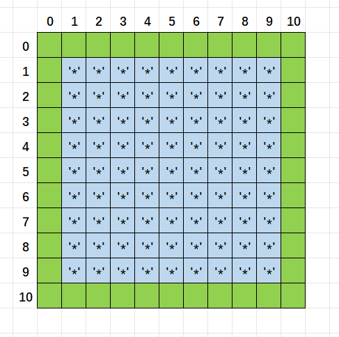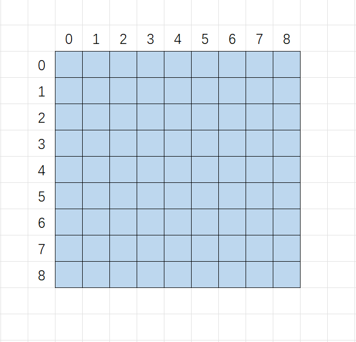 在扫雷的过程中,布置的雷和排查出的雷的信息都需要存储,所以我们需要一定的数据结构来存储这些信息。而我们已知需要在9*9的棋盘上布置雷的信息和排查雷,我们首先就可以想到创建一个9*9的数组来存放信息。如下图所示: