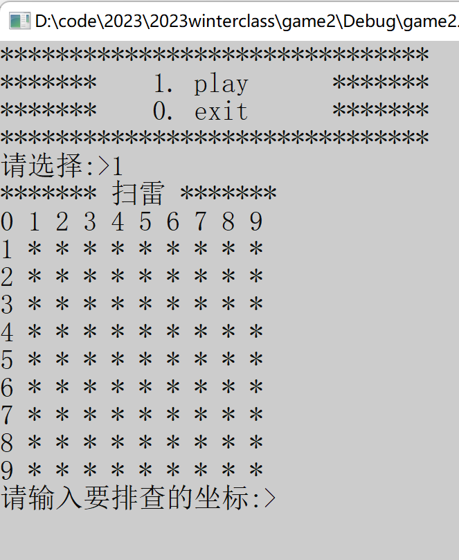因此在这我们采用另外一种方案,我们可以专门创建一个棋盘(对应一个数组mine),来存放布置好的雷的信息,再给另外一个棋盘(对应另外一个数组show)存放排查出的雷的信息,这样就不会互相干扰了。我们把雷布置到mine数组,在mine数组中对雷进行排查,再将排查出的数据存放在show数组,并且打印show数组的信息给后期排查参考。